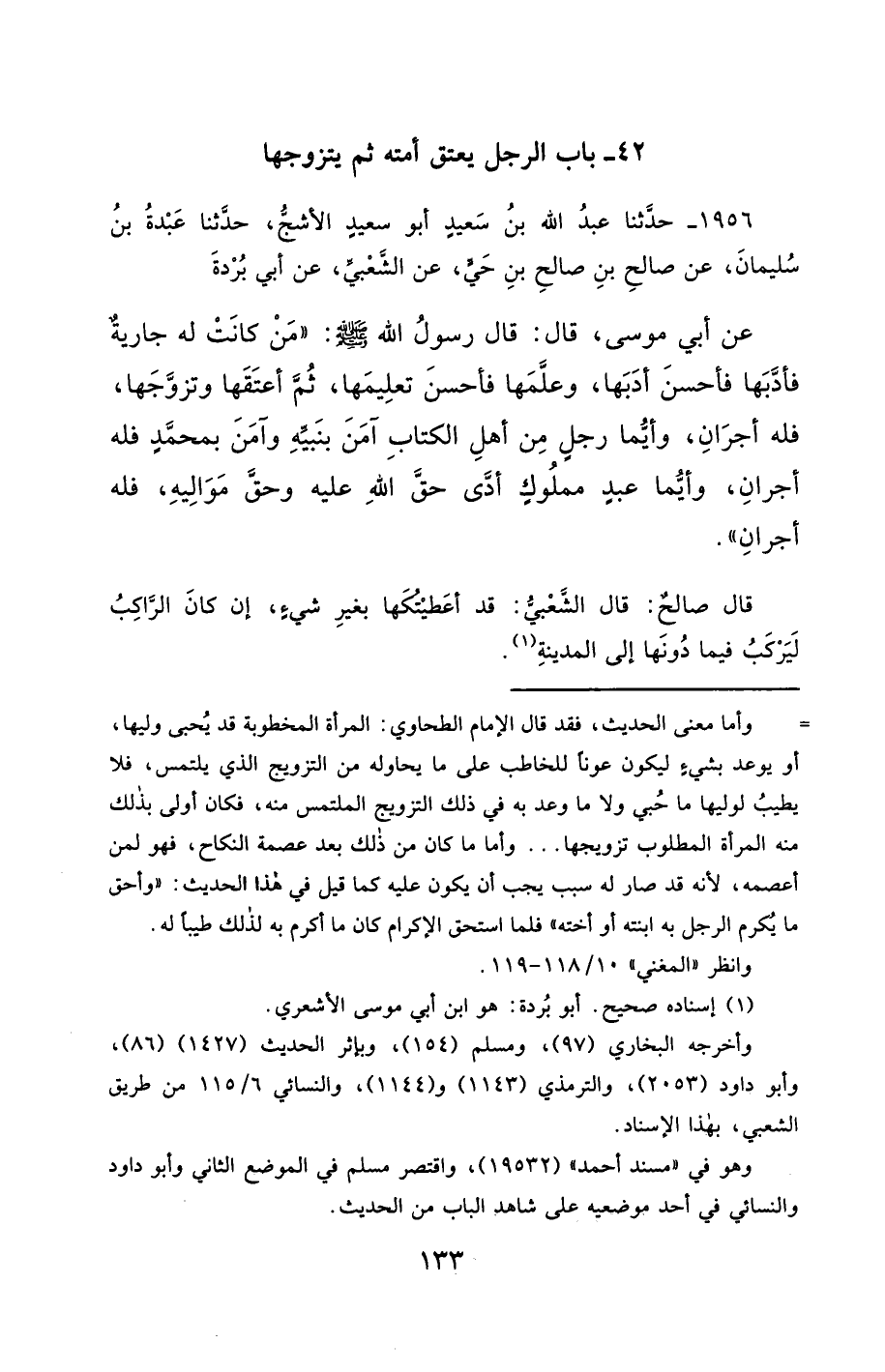 1956- حَدَّثَنَا عَبْدُ اللهِ بْنُ سَعِيدٍ أَبُو سَعِيدٍ الأَشَجُّ ، حَدَّثَنَا عَبْدَةُ بْنُ سُلَيْمَانَ ، عَنْ صَالِحِ بْنِ صَالِحِ بْنِ حَيٍّ ، عَنِ الشَّعْبِيِّ ، عَنْ أَبِي بُرْدَةَ ، عَنْ أَبِي مُوسَى ، قَالَ : قَالَ رَسُولُ اللهِ صَلَّى الله عَليْهِ وسَلَّمَ : مَنْ كَانَتْ لَهُ جَارِيَةٌ فَأَدَّبَهَا فَأَحْسَنَ أَدَبَهَا ، وَعَلَّمَهَا فَأَحْسَنَ تَعْلِيمَهَا ، ثُمَّ أَعْتَقَهَا وَتَزَوَّجَهَا ، فَلَهُ أَجْرَانِ ، وَأَيُّمَا رَجُلٍ مِنْ أَهْلِ الْكِتَابِ آمَنَ بِنَبِيِّهِ ، وَآمَنَ بِمُحَمَّدٍ ، فَلَهُ أَجْرَانِ ، وَأَيُّمَا عَبْدٍ مَمْلُوكٍ أَدَّى حَقَّ اللهِ عَلَيْهِ ، وَحَقَّ مَوَالِيهِ ، فَلَهُ أَجْرَانِ.