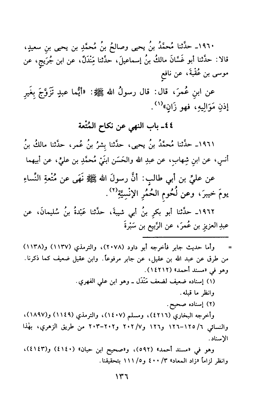 1960- حَدَّثَنَا مُحَمَّدُ بْنُ يَحْيَى ، وَصَالِحُ بْنُ مُحَمَّدِ بْنِ يَحْيَى بْنِ سَعِيدٍ ، قَالاَ : حَدَّثَنَا أَبُو غَسَّانَ مَالِكُ بْنُ إِسْمَاعِيلَ ، حَدَّثَنَا مَِنْدَلٌ ، عَنِ ابْنِ جُرَيْجٍ ، عَنْ مُوسَى بْنِ عُقْبَةَ ، عَنْ نَافِعٍ ، عَنِ ابْنِ عُمَرَ ، قَالَ : قَالَ رَسُولُ اللهِ صَلَّى الله عَليْهِ وسَلَّمَ : أَيُّمَا عَبْدٍ تَزَوَّجَ بِغَيْرِ إِذْنِ مَوَالِيهِ فَهُوَ زَانٍ.