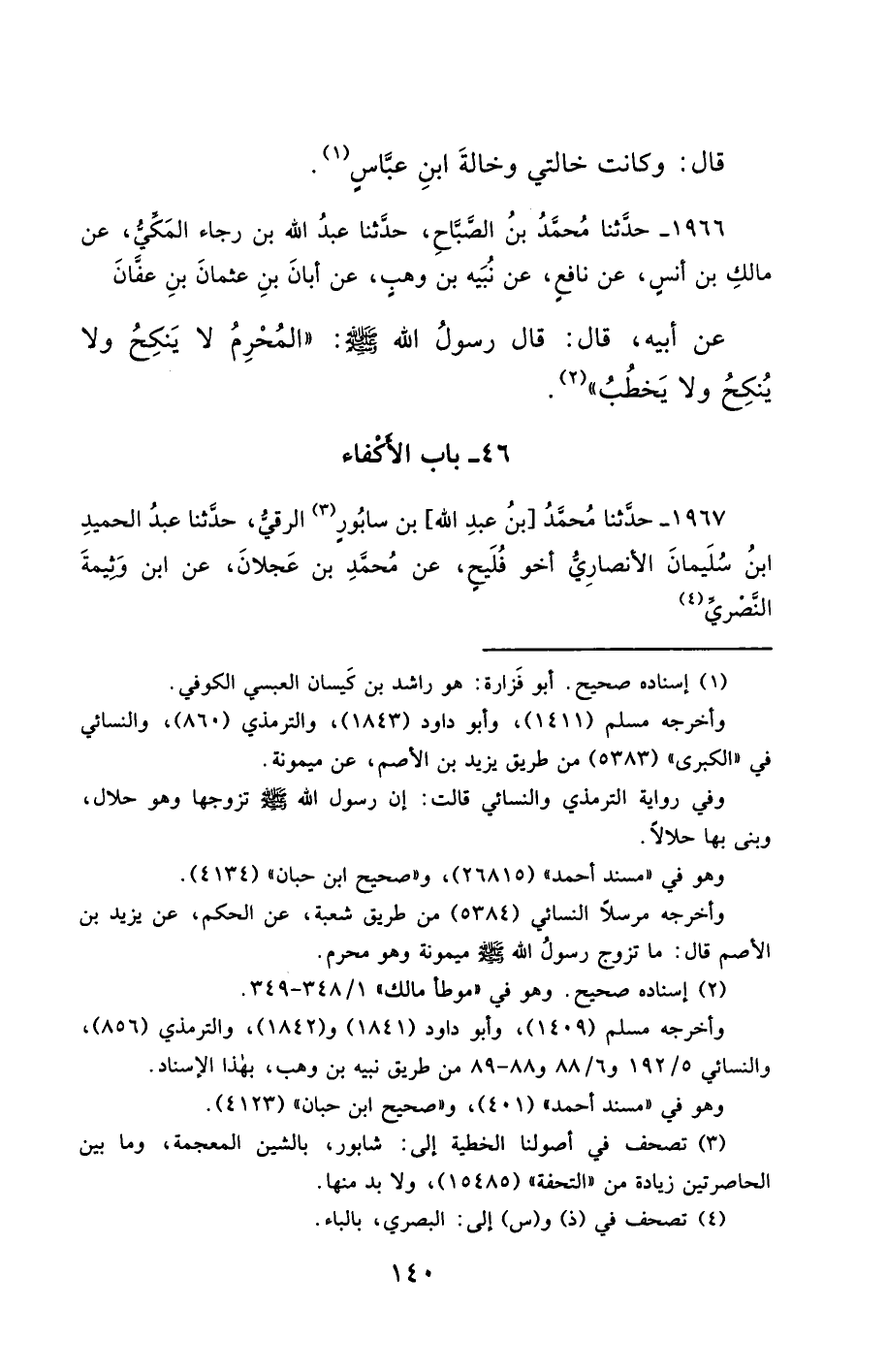 1966- حَدَّثَنَا مُحَمَّدُ بْنُ الصَّبَّاحِ ، حَدَّثَنَا عَبْدُ اللهِ بْنُ رَجَاءٍ الْمَكِّيُّ ، عَنْ مَالِكِ بْنِ أَنَسٍ ، عَنْ نَافِعٍ ، عَنْ نُبَيْهِ بْنِ وَهْبٍ ، عَنْ أَبَانَ بْنِ عُثْمَانَ بْنِ عَفَّانَ ، عَنْ أَبِيهِ ، قَالَ : قَالَ رَسُولُ اللهِ صَلَّى الله عَليْهِ وسَلَّمَ : الْمُحْرِمُ لاَ يَنْكِحُ ، وَلاَ يُنْكِحُ ، وَلاَ يَخْطُبُ.