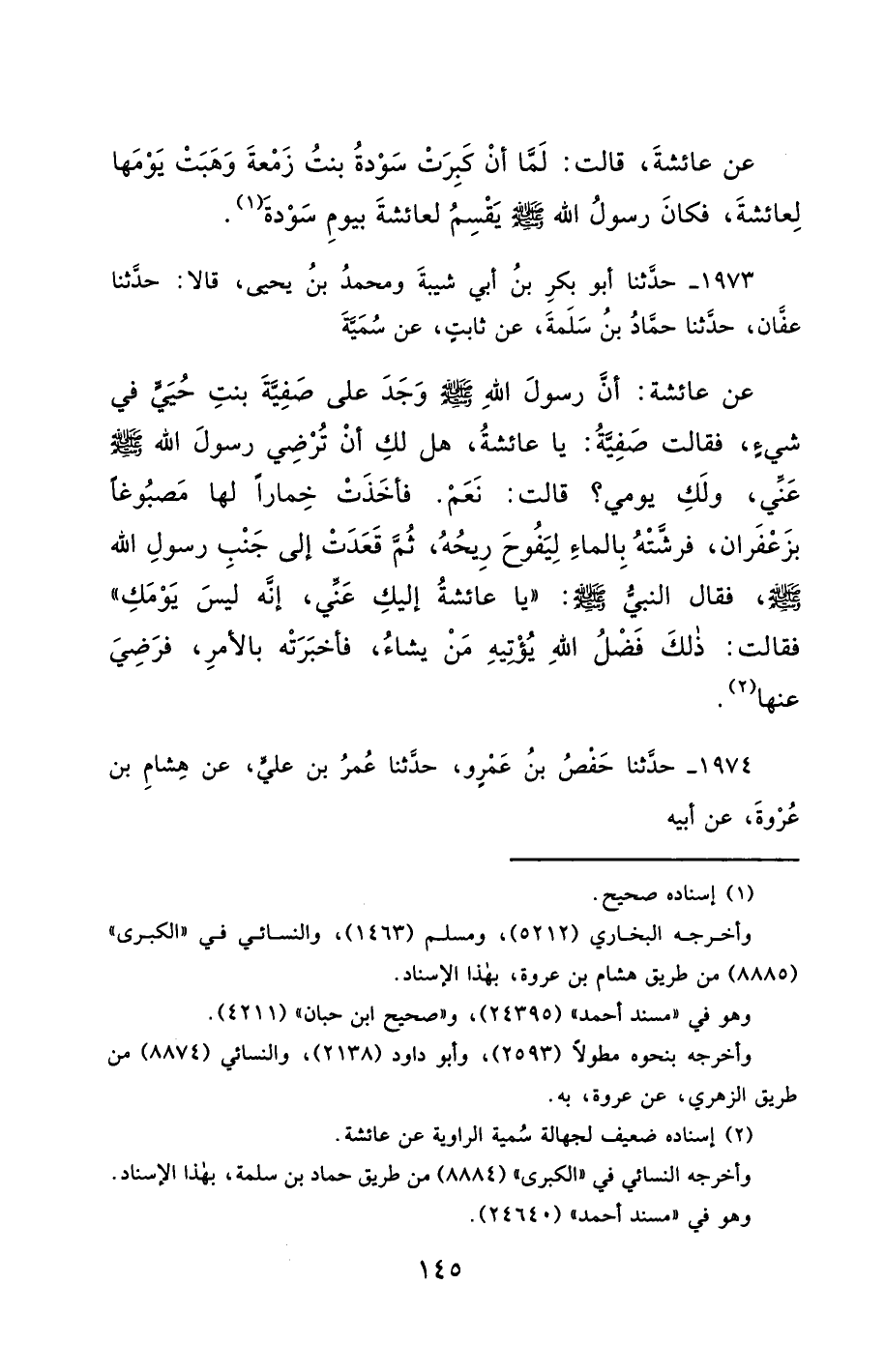1973- حَدَّثَنَا أَبُو بَكْرِ بْنُ أَبِي شَيْبَةَ ، وَمُحَمَّدُ بْنُ يَحْيَى ، قَالاَ : حَدَّثَنَا عَفَّانُ ، حَدَّثَنَا حَمَّادُ بْنُ سَلَمَةَ ، عَنْ ثَابِتٍ ، عَنْ سُمَيَّةَ ، عَنْ عَائِشَةَ ، أَنَّ رَسُولَ اللهِ صَلَّى الله عَليْهِ وسَلَّمَ وَجَدَ عَلَى صَفِيَّةَ بِنْتِ حُيَيٍّ فِي شَيْءٍ ، فَقَالَتْ صَفِيَّةُ : يَا عَائِشَةُ ، هَلْ لَكِ أَنْ تُرْضِي رَسُولَ اللهِ صَلَّى الله عَليْهِ وسَلَّمَ عَنِّي ، وَلَكِ يَوْمِي ؟ قَالَتْ : نَعَمْ ، فَأَخَذَتْ خِمَارًا لَهَا مَصْبُوغًا بِزَعْفَرَانٍ ، فَرَشَّتْهُ بِالْمَاءِ لِيَفُوحَ رِيحُهُ ، ثُمَّ قَعَدَتْ إِلَى جَنْبِ رَسُولُ اللهِ صَلَّى الله عَليْهِ وسَلَّمَ ، فَقَالَ النَّبِيُّ صَلَّى الله عَليْهِ وسَلَّمَ : يَا عَائِشَةُ ، إِلَيْكِ عَنِّي ، إِنَّهُ لَيْسَ يَوْمَكِ ، فَقَالَتْ : ذَلِكَ فَضْلُ اللهِ يُؤْتِيهِ مَنْ يَشَاءُ ، فَأَخْبَرَتْهُ بِالأَمْرِ ، فَرَضِيَ عَنْهَا.