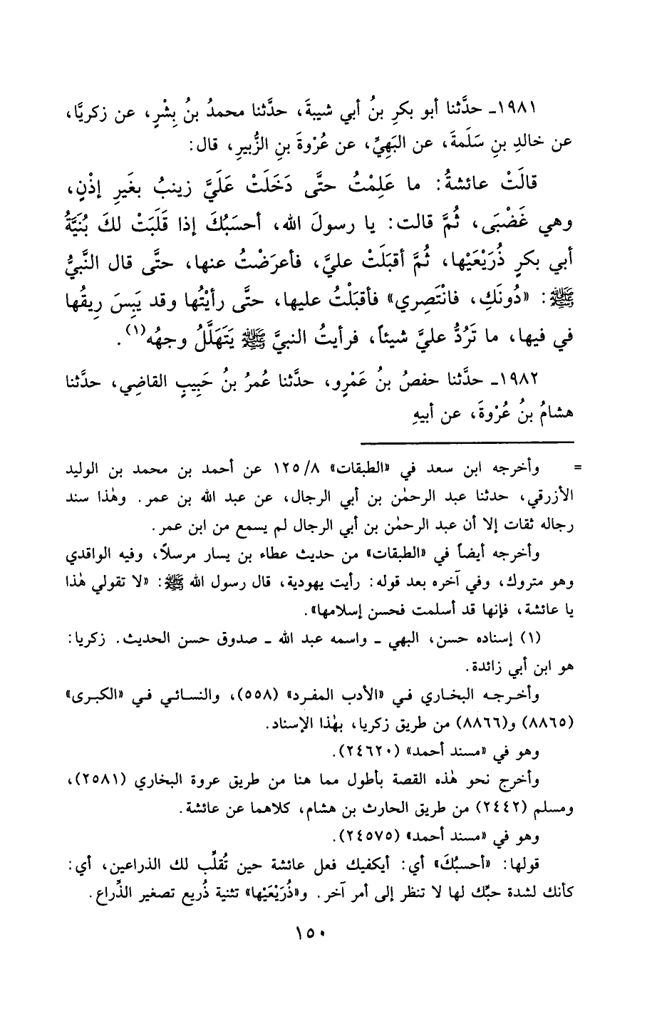 1981- حَدَّثَنَا أَبُو بَكْرِ بْنُ أَبِي شَيْبَةَ ، حَدَّثَنَا مُحَمَّدُ بْنُ بِشْرٍ ، عَنْ زَكَرِيَّا ، عَنْ خَالِدِ بْنِ سَلَمَةَ ، عَنِ الْبَهِيِّ ، عَنْ عُرْوَةَ بْنِ الزُّبَيْرِ ، قَالَ : قَالَتْ عَائِشَةُ : مَا عَلِمْتُ حَتَّى دَخَلَتْ عَلَيَّ زَيْنَبُ بِغَيْرِ إِذْنٍ وَهِيَ غَضْبَى ، ثُمَّ قَالَتْ : يَا رَسُولَ اللهِ ، أَحْسَبُكَ إِذَا قَلَبَتْ لَكَ بُنَيَّةُ أَبِي بَكْرٍ ذُرَيْعَيْهَا ، ثُمَّ أَقَبَلَتْ عَلَيَّ ، فَأَعْرَضْتُ عَنْهَا ، حَتَّى قَالَ النَّبِيُّ صَلَّى الله عَليْهِ وسَلَّمَ : دُونَكِ ، فَانْتَصِرِي ، فَأَقْبَلْتُ عَلَيْهَا ، حَتَّى رَأَيْتُهَا وَقَدْ يَبِسَ رِيقُهَا فِي فِيهَا ، مَا تَرُدُّ عَلَيَّ شَيْئًا ، فَرَأَيْتُ النَّبِيَّ صَلَّى الله عَليْهِ وسَلَّمَ يَتَهَلَّلُ وَجْهُهُ.