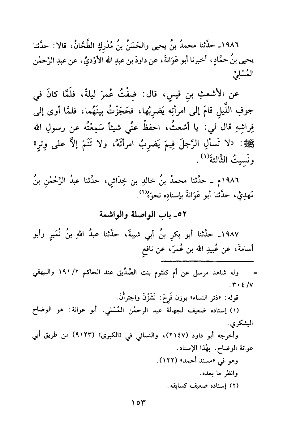 1986- حَدَّثَنَا مُحَمَّدُ بْنُ يَحْيَى ، والْحَسَنُ بْنُ مُدْرِكٍ الطَّحَّانُ ، قَالاَ : حَدَّثَنَا يَحْيَى بْنُ حَمَّادٍ ، حَدَّثَنَا أَبُو عَوَانَةَ ، عَنْ دَاوُدَ بْنِ عَبْدِ اللهِ الأَوْدِيِّ ، عَنْ عَبْدِ الرَّحْمَنِ الْمُسْلِيِّ ، عَنِ الأَشْعَثِ بْنِ قَيْسٍ ، قَالَ : ضِفْتُ عُمَرَ لَيْلَةً ، فَلَمَّا كَانَ فِي جَوْفِ اللَّيْلِ ، قَامَ إِلَى امْرَأَتِهِ يَضْرِبُهَا ، فَحَجَزْتُ بَيْنَهُمَا ، فَلَمَّا أَوَى إِلَى فِرَاشِهِ قَالَ لِي : يَا أَشْعَثُ ، احْفَظْ عَنِّي شَيْئًا سَمِعْتُهُ عَنْ رَسُولِ اللهِ صَلَّى الله عَليْهِ وسَلَّمَ ، لاَ تَسْأَلِ الرَّجُلَ فِيمَ يَضْرِبُ امْرَأَتَهُ ، وَلاَ تَنَمْ إِلاَّ عَلَى وِتْرٍ ، وَنَسِيتُ الثَّالِثَةَ.
