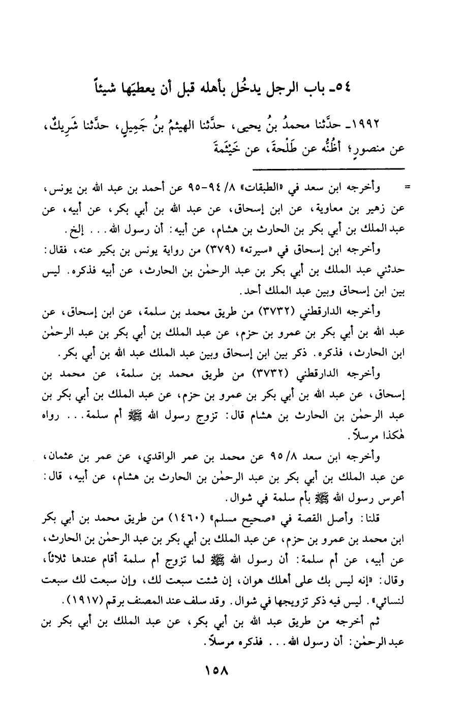 1992- حَدَّثَنَا مُحَمَّدُ بْنُ يَحْيَى ، حَدَّثَنَا الْهَيْثَمُ بْنُ جَمِيلٍ ، حَدَّثَنَا شَرِيكٌ ، عَنْ مَنْصُورٍ ؛ أَظُنُّهُ عَنْ طَلْحَةَ ، عَنْ خَيْثَمَةَ ، عَنْ عَائِشَةَ ، أَنَّ رَسُولَ اللهِ صَلَّى الله عَليْهِ وسَلَّمَ أَمَرَهَا أَنْ تُدْخِلَ عَلَى رَجُلٍ امْرَأَتَهُ قَبْلَ أَنْ يُعْطِيَهَا شَيْئًا.
