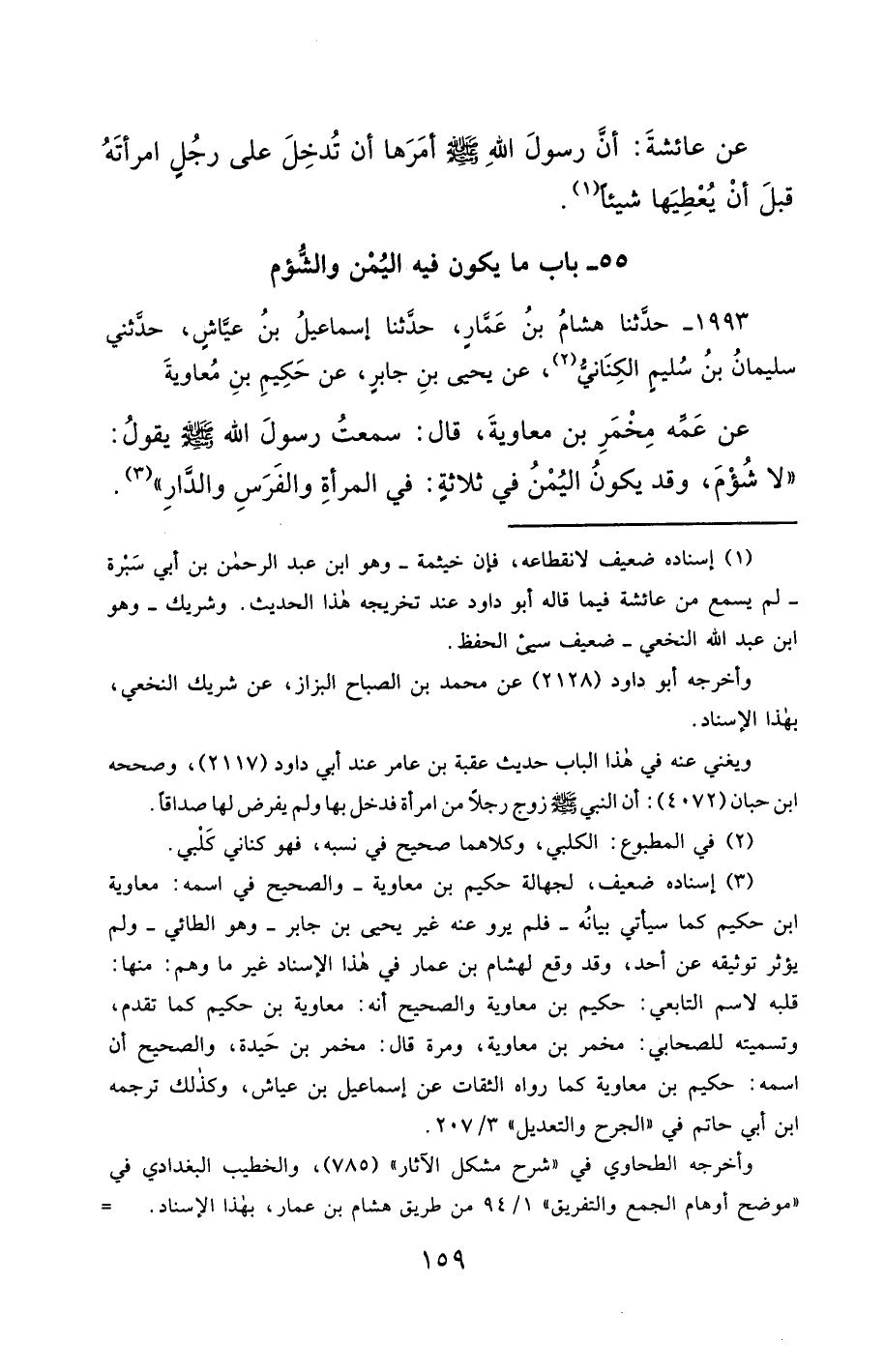 1993- حَدَّثَنَا هِشَامُ بْنُ عَمَّارٍ ، حَدَّثَنَا إِسْمَاعِيلُ بْنُ عَيَّاشٍ , حَدَّثَنِي سُلَيْمَانُ بْنُ سُلَيْمٍ الْكِنَانِيُّ ، عَنْ يَحْيَى بْنِ جَابِرٍ ، عَنْ حَكِيمِ بْنِ مُعَاوِيَةَ ، عَنْ عَمِّهِ مِخْمَرِ بْنِ مُعَاوِيَةَ ، قَالَ : سَمِعْتُ رَسُولَ اللهِ صَلَّى الله عَليْهِ وسَلَّمَ ، يَقُولُ : لاَ شُؤْمَ ، وَقَدْ يَكُونُ الْيُمْنُ فِي ثَلاَثَةٍ : فِي الْمَرْأَةِ ، وَالْفَرَسِ ، وَالدَّارِ.