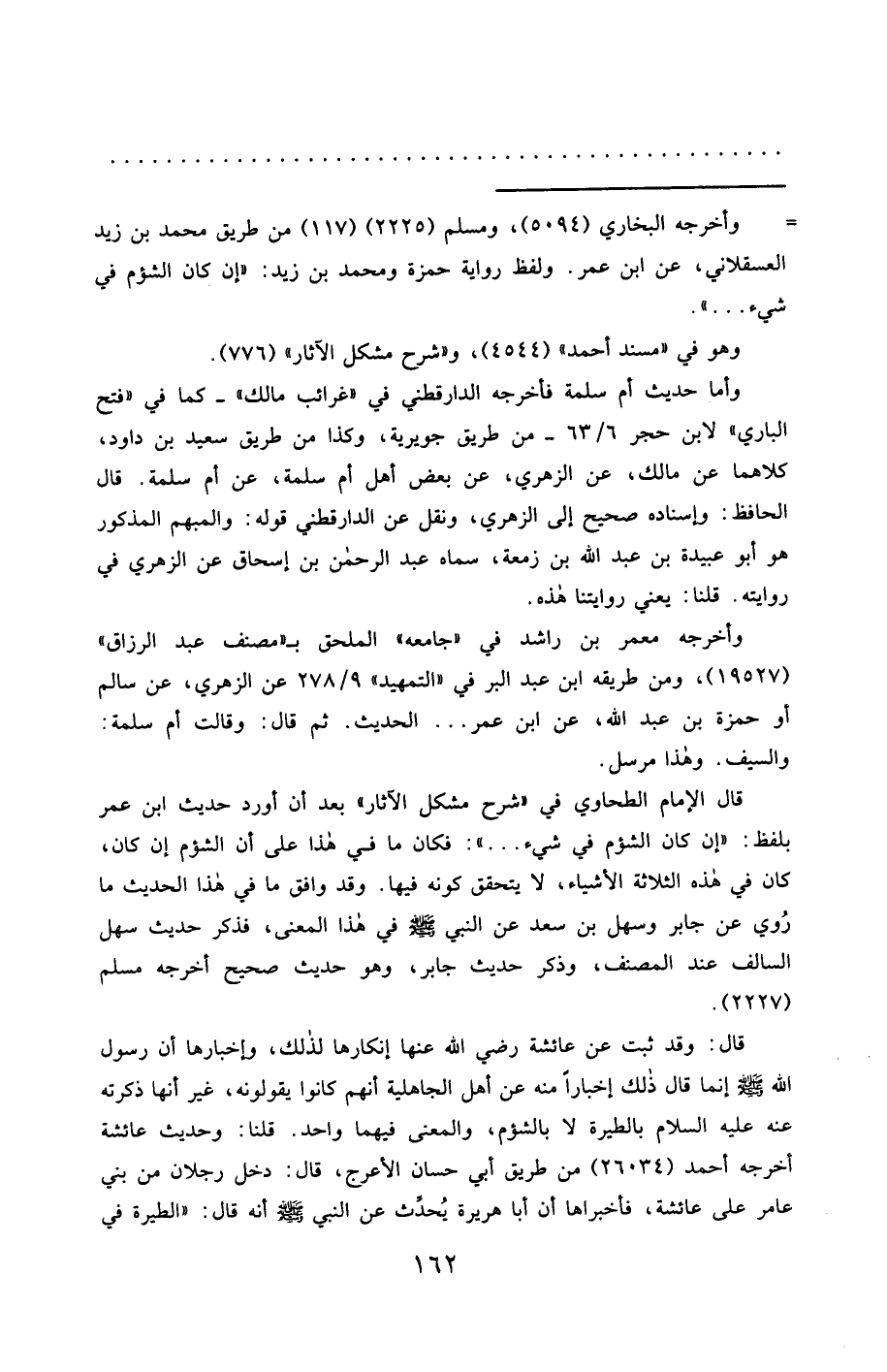 قال: وقد ثبت عن عائشة رضي الله عنها إنكارها لذلك، واخبارها أن رسول الله - صَلَّى اللَّهُ عَلَيْهِ وَسَلَّمَ - إنما قال ذلك إخبارًا منه عن أهل الجاهلية أنهم كانوا يقولونه، غير أنها ذكرته عنه عليه السلام بالطيرة لا بالشؤم، والمعنى فيهما واحد. قلنا: وحديث عائشة أخرجه أحمد (26034) من طريق أبي حسان الأعرج، قال: دخل رجلان من بني عامر على عائشة، فأخبراها أن أبا هريرة يُحدث عن النبي - صَلَّى اللَّهُ عَلَيْهِ وَسَلَّمَ - أنه قال: "الطيرة في