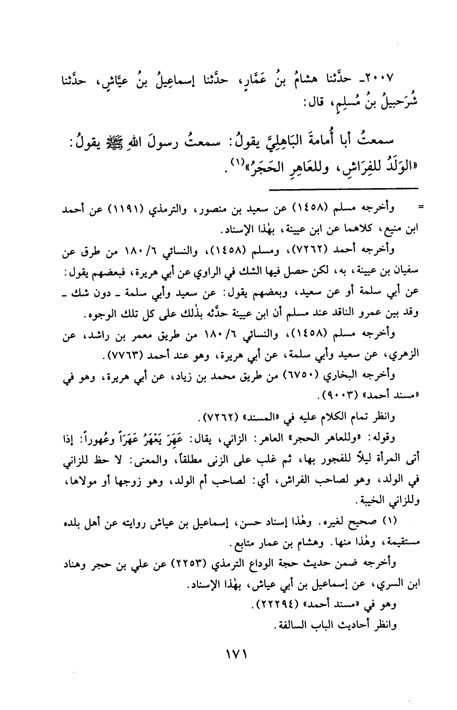 2007- حَدَّثَنَا هِشَامُ بْنُ عَمَّارٍ ، حَدَّثَنَا إِسْمَاعِيلُ بْنُ عَيَّاشٍ ، حَدَّثَنَا شُرَحْبِيلُ بْنُ مُسْلِمٍ ، قَالَ : سَمِعْتُ أَبَا أُمَامَةَ الْبَاهِلِيَّ يَقُولُ : سَمِعْتُ رَسُولَ اللهِ صَلَّى الله عَليْهِ وسَلَّمَ يَقُولُ : الْوَلَدُ لِلْفِرَاشِ ، وَلِلْعَاهِرِ الْحَجَرُ.