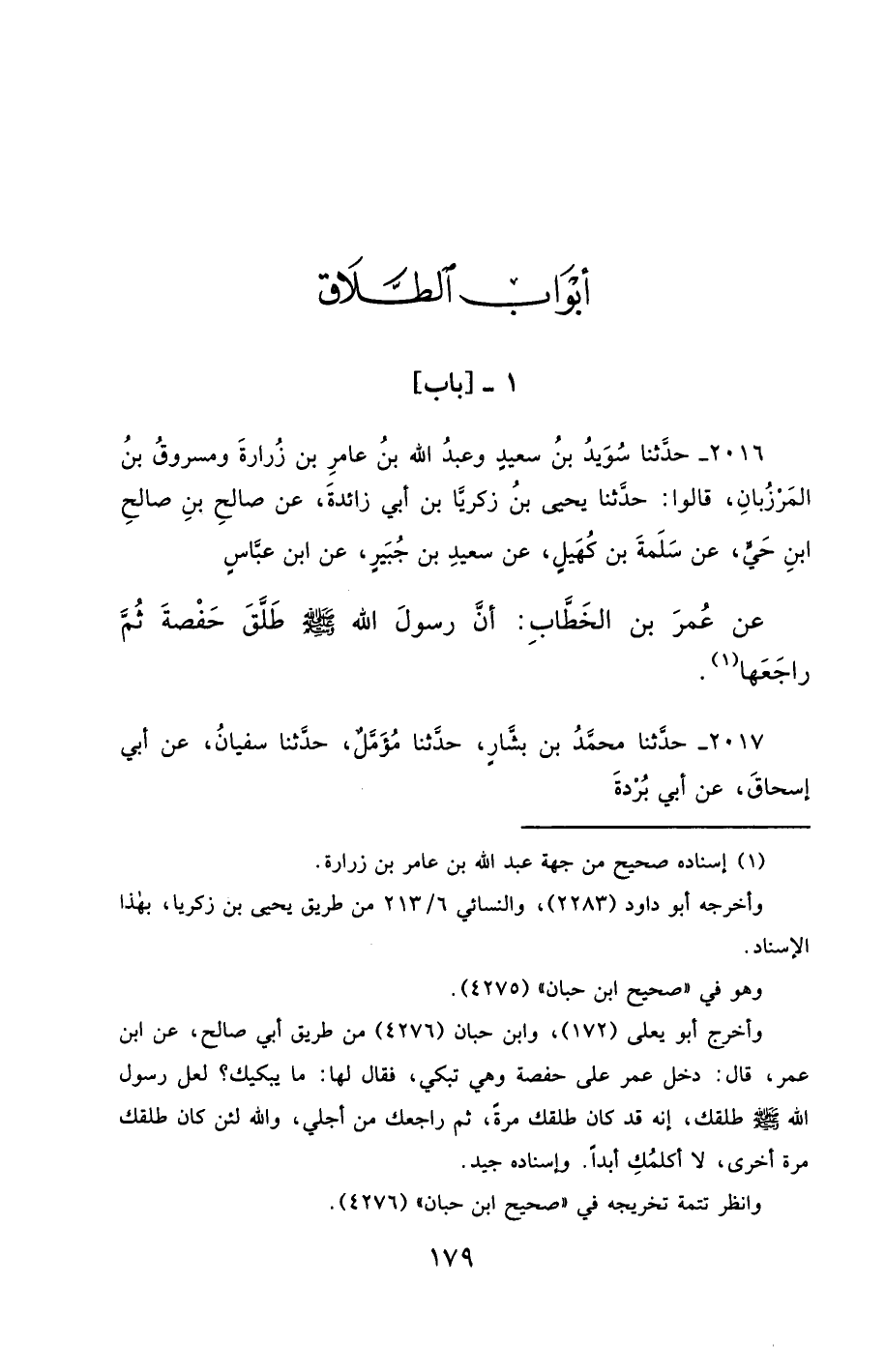2016- حَدَّثَنَا سُوَيْدُ بْنُ سَعِيدٍ ، وَعَبْدُ اللهِ بْنُ عَامِرِ بْنِ زُرَارَةَ ، وَمَسْرُوقُ بْنُ الْمَرْزُبَانِ ، قَالُوا : حَدَّثَنَا يَحْيَى بْنُ زَكَرِيَّا بْنِ أَبِي زَائِدَةَ ، عَنْ صَالِحِ بْنِ صَالِحِ بْنِ حَيٍّ ، عَنْ سَلَمَةَ بْنِ كُهَيْلٍ ، عَنْ سَعِيدِ بْنِ جُبَيْرٍ ، عَنِ ابْنِ عَبَّاسٍ ، عَنْ عُمَرَ بْنِ الْخَطَّابِ ، أَنَّ رَسُولَ اللهِ صَلَّى الله عَليْهِ وسَلَّمَ طَلَّقَ حَفْصَةَ ، ثُمَّ رَاجَعَهَا.