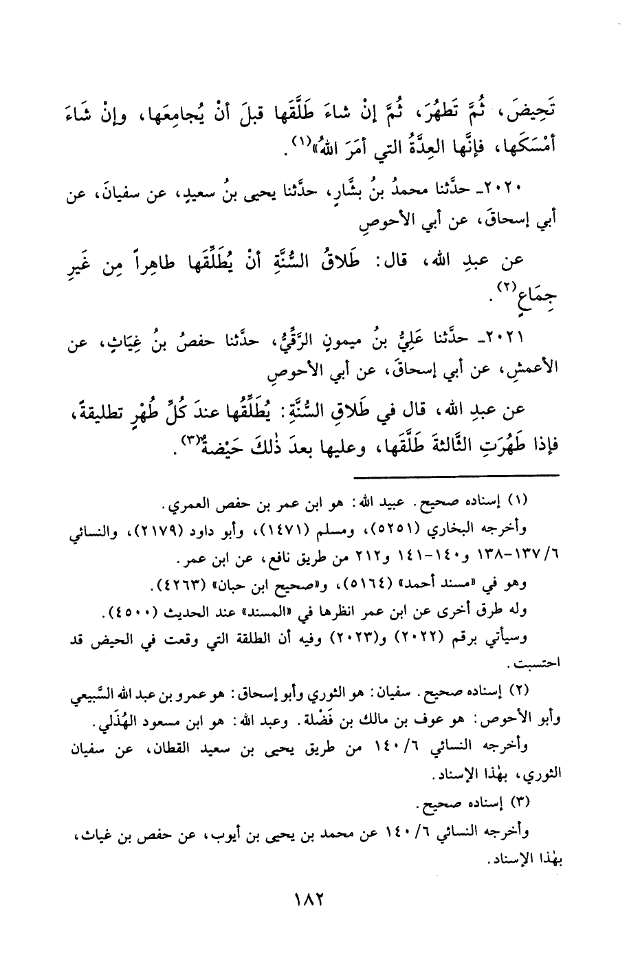 2020- حَدَّثَنَا مُحَمَّدُ بْنُ بَشَّارٍ ، حَدَّثَنَا يَحْيَى بْنُ سَعِيدٍ ، عَنْ سُفْيَانَ ، عَنْ أَبِي إِسْحَاقَ ، عَنْ أَبِي الأَحْوَصِ ، عَنْ عَبْدِ اللهِ ، قَالَ : طَلاَقُ السُّنَّةِ أَنْ يُطَلِّقَهَا طَاهِرًا مِنْ غَيْرِ جِمَاعٍ.