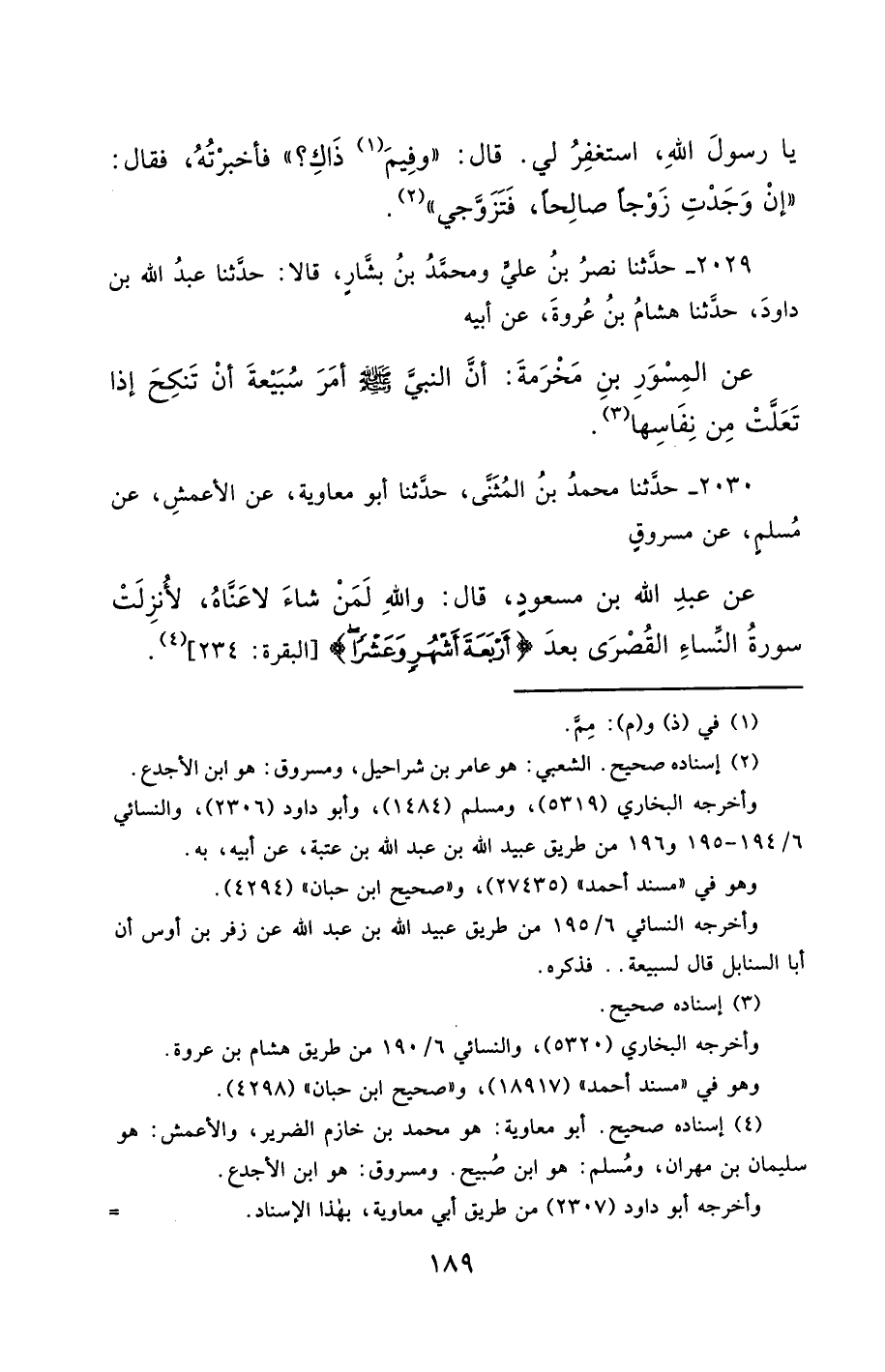 2029- حَدَّثَنَا نَصْرُ بْنُ عَلِيٍّ ، وَمُحَمَّدُ بْنُ بَشَّارٍ ، قَالاَ : حَدَّثَنَا عَبْدُ اللهِ بْنُ دَاوُدَ ، حَدَّثَنَا هِشَامُ بْنُ عُرْوَةَ ، عَنْ أَبِيهِ ، عَنِ الْمِسْوَرِ بْنِ مَخْرَمَةَ ، أَنَّ النَّبِيَّ صَلَّى الله عَليْهِ وسَلَّمَ أَمَرَ سُبَيْعَةَ أَنْ تَنْكِحَ إِذَا تَعَلَّتْ مِنْ نِفَاسِهَا.