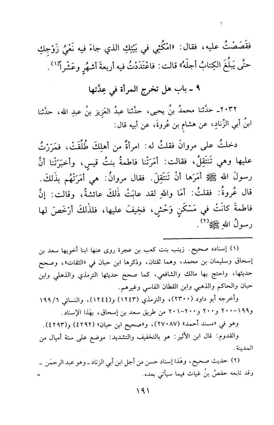 2032- حَدَّثَنَا مُحَمَّدُ بْنُ يَحْيَى ، حَدَّثَنَا عَبْدُ الْعَزِيزِ بْنُ عَبْدِ اللهِ ، حَدَّثَنَا ابْنُ أَبِي الزِّنَادِ ، عَنْ هِشَامِ بْنِ عُرْوَةَ ، عَنْ أَبِيهِ ، قَالَ : دَخَلْتُ عَلَى مَرْوَانَ ، فَقُلْتُ لَهُ : امْرَأَةٌ مِنْ أَهْلِكَ طُلِّقَتْ ، فَمَرَرْتُ عَلَيْهَا وَهِيَ تَنْتَقِلُ ، فَقَالَتْ : أَمَرَتْنَا فَاطِمَةُ بِنْتُ قَيْسٍ ، وَأَخْبَرَتْنَا أَنَّ رَسُولَ اللهِ صَلَّى الله عَليْهِ وسَلَّمَ أَمَرَهَا أَنْ تَنْتَقِلَ ، فَقَالَ مَرْوَانُ : هِيَ أَمَرَتْهُمْ بِذَلِكَ ؟ قَالَ عُرْوَةُ ، فَقُلْتُ : أَمَا وَاللَّهِ لَقَدْ عَابَتْ ذَلِكَ عَائِشَةُ ، وَقَالَتْ : إِنَّ فَاطِمَةَ كَانَتْ فِي مَسْكَنٍ وَحْشٍ فَخِيفَ عَلَيْهَا ، فَلِذَلِكَ أَرْخَصَ لَهَا رَسُولُ اللهِ صَلَّى الله عَليْهِ وسَلَّمَ.