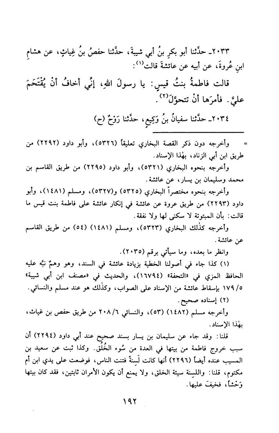2033- حَدَّثَنَا أَبُو بَكْرِ بْنُ أَبِي شَيْبَةَ ، حَدَّثَنَا حَفْصُ بْنُ غِيَاثٍ ، عَنْ هِشَامِ بْنِ عُرْوَةَ ، عَنْ أَبِيهِ , (1), قَالَ : قَالَتْ فَاطِمَةُ بِنْتُ قَيْسٍ : يَا رَسُولَ اللهِ ، إِنِّي أَخَافُ أَنْ يُقْتَحَمَ عَلَيَّ ، فَأَمَرَهَا أَنْ تَتَحَوَّلَ.