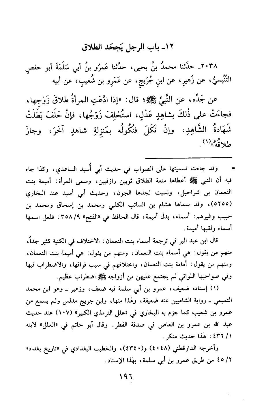 2038- حَدَّثَنَا مُحَمَّدُ بْنُ يَحْيَى ، حَدَّثَنَا عَمْرُو بْنُ أَبِي سَلَمَةَ أَبُو حَفْصٍ التِّنِّيسِيُّ ، عَنْ زُهَيْرٍ ، عَنِ ابْنِ جُرَيْجٍ ، عَنْ عَمْرِو بْنِ شُعَيْبٍ ، عَنْ أَبِيهِ ، عَنْ جَدِّهِ ، عَنِ النَّبِيِّ صَلَّى الله عَليْهِ وسَلَّمَ ، قَالَ : إِذَا ادَّعَتِ الْمَرْأَةُ طَلاَقَ زَوْجِهَا ، فَجَاءَتْ عَلَى ذَلِكَ بِشَاهِدٍ عَدْلٍ ، اسْتُحْلِفَ زَوْجُهَا ، فَإِنْ حَلَفَ بَطَلَتْ شَهَادَةُ الشَّاهِدِ ، وَإِنْ نَكَلَ ، فَنُكُولُهُ بِمَنْزِلَةِ شَاهِدٍ آخَرَ ، وَجَازَ طَلاَقُهُ.