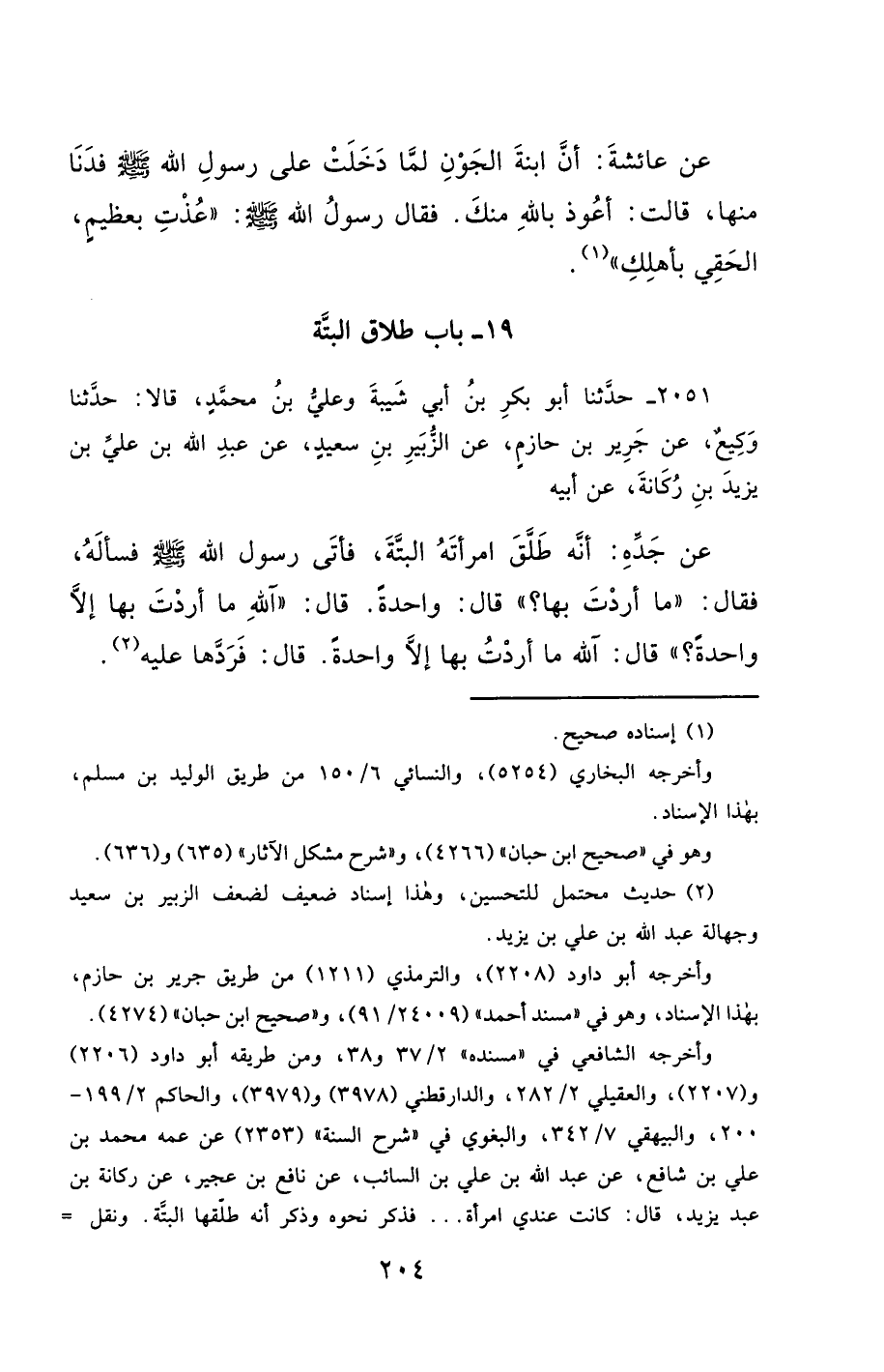 2051- حَدَّثَنَا أَبُو بَكْرِ بْنُ أَبِي شَيْبَةَ ، وَعَلِيُّ بْنُ مُحَمَّدٍ ، قَالاَ : حَدَّثَنَا وَكِيعٌ ، عَنْ جَرِيرِ بْنِ حَازِمٍ ، عَنِ الزُّبَيْرِ بْنِ سَعِيدٍ ، عَنْ عَبْدِ اللهِ بْنِ عَلِيِّ بْنِ يَزِيدَ بْنِ رُكَانَةَ ، عَنْ أَبِيهِ ، عَنْ جَدِّهِ ، أَنَّهُ طَلَّقَ امْرَأَتَهُ الْبَتَّةَ ، فَأَتَى رَسُولَ اللهِ صَلَّى الله عَليْهِ وسَلَّمَ فَسَأَلَهُ ، فَقَالَ : مَا أَرَدْتَ بِهَا ؟ قَالَ : وَاحِدَةً ، قَالَ : آللَّهِ مَا أَرَدْتَ بِهَا إِلاَّ وَاحِدَةً ؟ قَالَ : آللَّهِ مَا أَرَدْتُ بِهَا إِلاَّ وَاحِدَةً ، قَالَ : فَرَدَّهَا عَلَيْهِ.