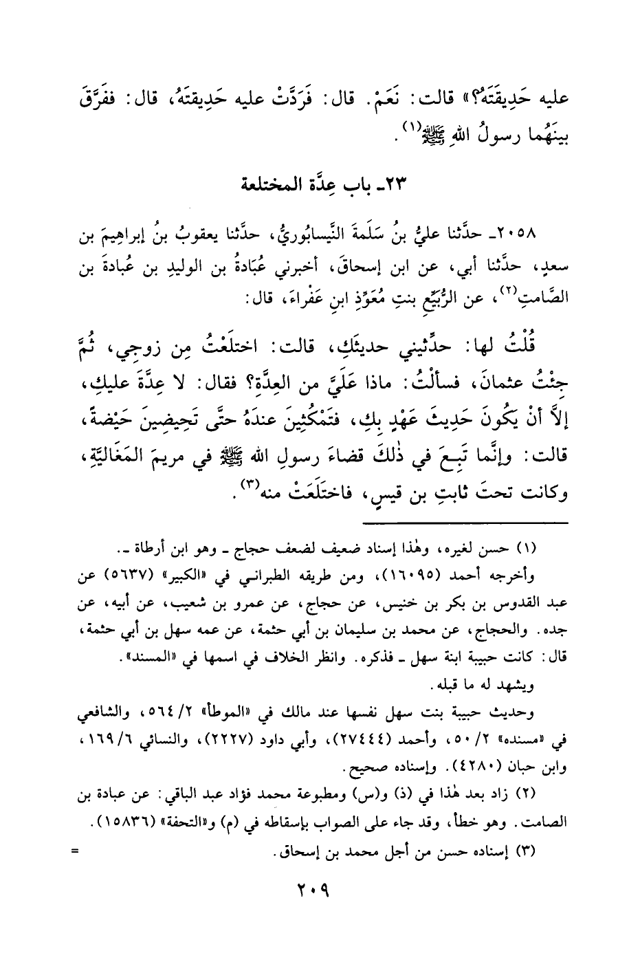 2058- حَدَّثَنَا عَلِيُّ بْنُ سَلَمَةَ النَّيْسَابُورِيُّ ، حَدَّثَنَا يَعْقُوبُ بْنُ إِبْرَاهِيمَ بْنِ سَعْدٍ ، حَدَّثَنَا أَبِي ، عَنِ ابْنِ إِسْحَاقَ ، أَخْبَرَنِي عُبَادَةُ بْنُ الْوَلِيدِ بْنِ عُبَادَةَ بْنِ الصَّامِتِ ، عَنِ الرُّبَيِّعِ بِنْتِ مُعَوِّذِ ابْنِ عَفْرَاءَ ، قَالَ : قُلْتُ لَهَا : حَدِّثِينِي حَدِيثَكِ ، قَالَتْ : اخْتَلَعْتُ مِنْ زَوْجِي ، ثُمَّ جِئْتُ عُثْمَانَ ، فَسَأَلْتُ : مَاذَا عَلَيَّ مِنَ الْعِدَّةِ ؟ فَقَالَ : لاَ عِدَّةَ عَلَيْكِ ، إِلاَّ أَنْ يَكُونَ حَدِيثَ عَهْدٍ بِكِ ، فَتَمْكُثِينَ عِنْدَهُ حَتَّى تَحِيضِينَ حَيْضَةً ، قَالَتْ : وَإِنَّمَا تَبِعَ فِي ذَلِكَ قَضَاءَ رَسُولِ اللهِ صَلَّى الله عَليْهِ وسَلَّمَ فِي مَرْيَمَ الْمَغَالِيَّةِ ، وَكَانَتْ تَحْتَ ثَابِتِ بْنِ قَيْسٍ ، فَاخْتَلَعَتْ مِنْهُ.