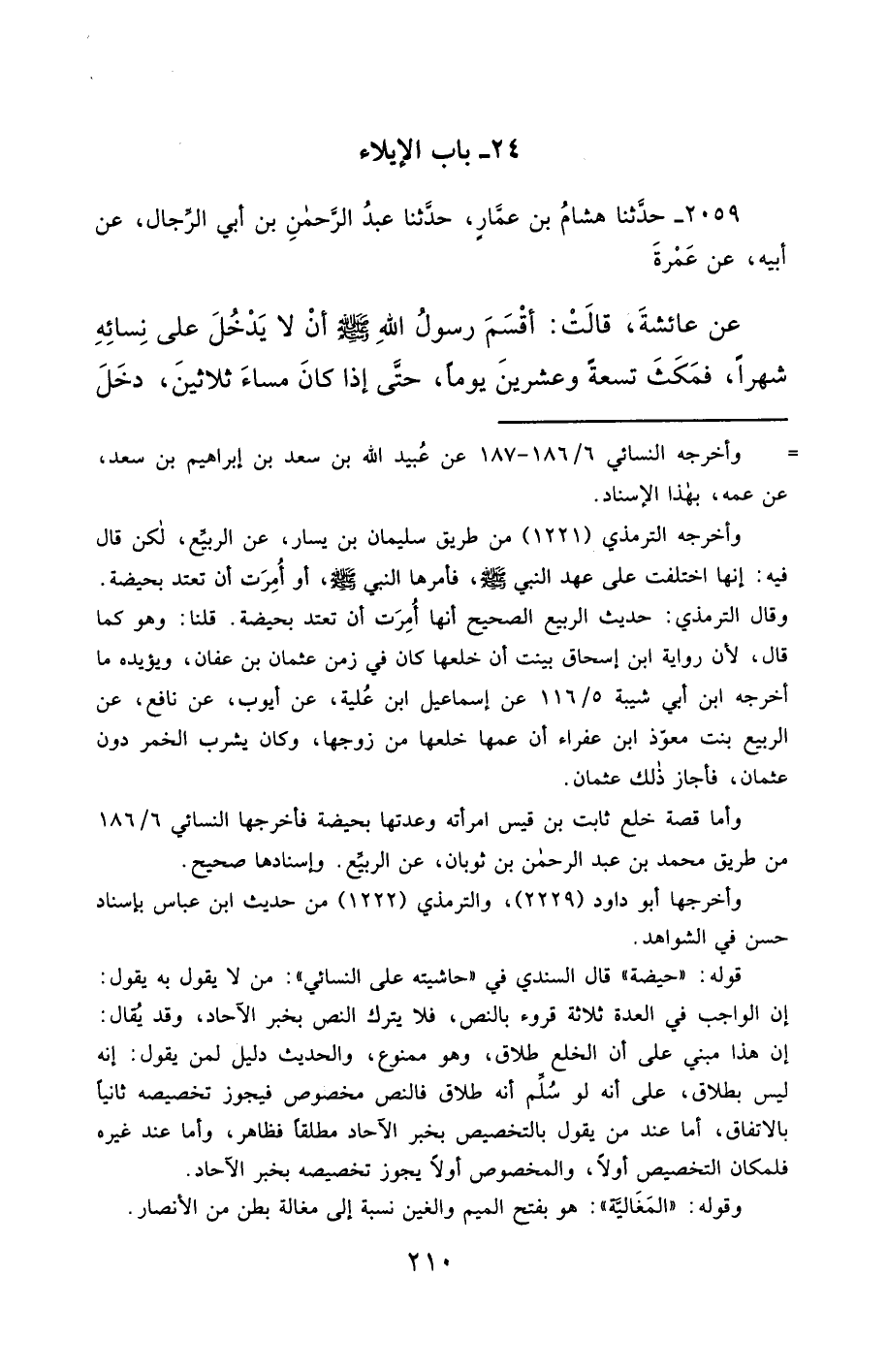 2059- حَدَّثَنَا هِشَامُ بْنُ عَمَّارٍ ، حَدَّثَنَا عَبْدُ الرَّحْمَنِ بْنُ أَبِي الرِّجَالِ ، عَنْ أَبِيهِ ، عَنْ عَمْرَةَ ، عَنْ عَائِشَةَ ، قَالَتْ : أَقْسَمَ رَسُولُ اللهِ صَلَّى الله عَليْهِ وسَلَّمَ أَنْ لاَ يَدْخُلَ عَلَى نِسَائِهِ شَهْرًا ، فَمَكَثَ تِسْعَةً وَعِشْرِينَ يَوْمًا ، حَتَّى إِذَا كَانَ مِسَاءَ ثَلاَثِينَ ، دَخَلَ عَلَيَّ ، فَقُلْتُ : إِنَّكَ أَقْسَمْتَ أَنْ لاَ تَدْخُلَ عَلَيْنَا شَهْرًا ، فَقَالَ : الشَّهْرُ كَذَا ، يُرْسِلُ أَصَابِعَهُ فِيهِ ثَلاَثَ مَرَّاتٍ ، وَالشَّهْرُ كَذَا ، وَأَرْسَلَ أَصَابِعَهُ كُلَّهَا ، وَأَمْسَكَ إِصْبَعًا وَاحِدًا فِي الثَّالِثَةِ.