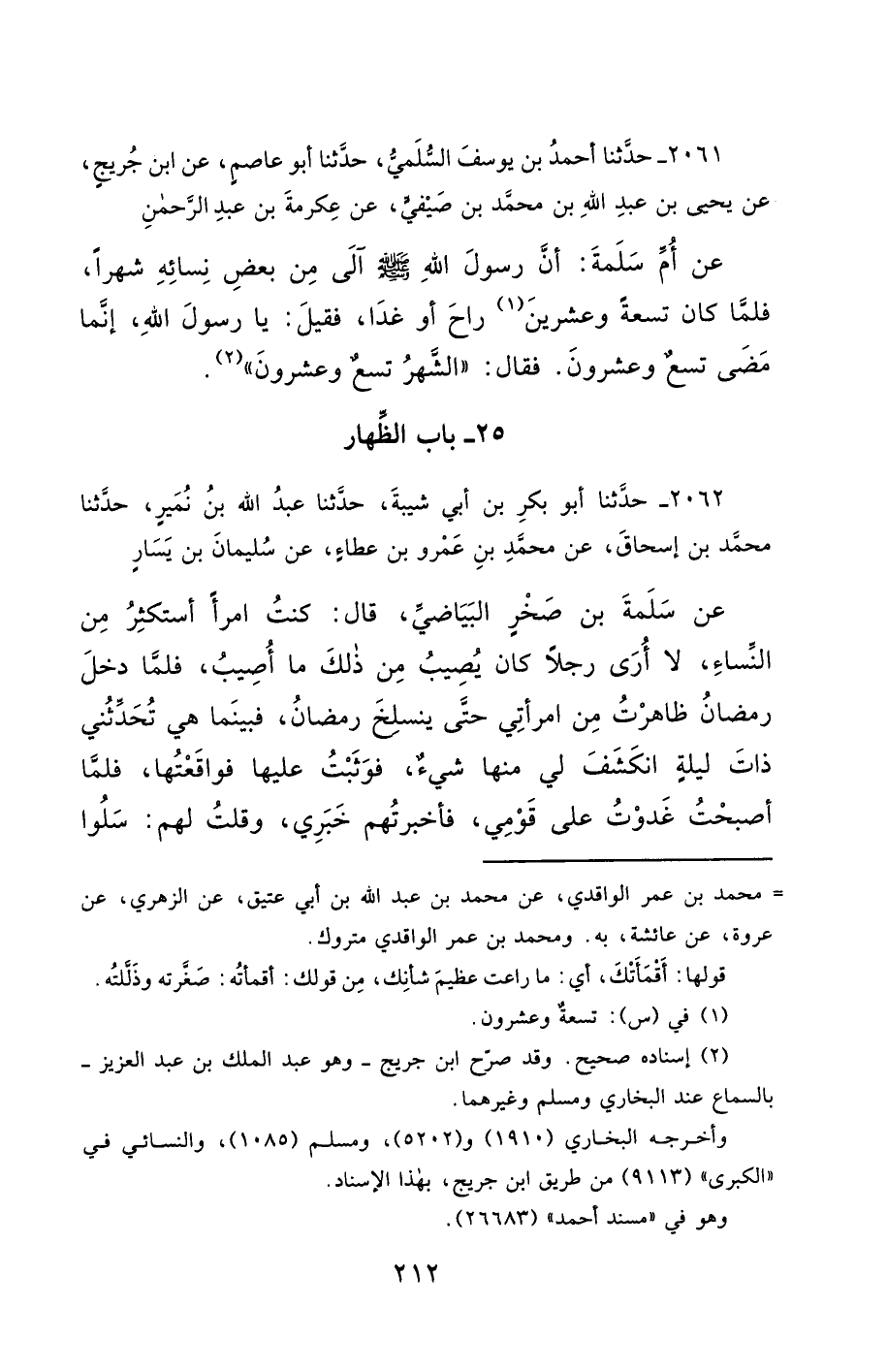 2061- حَدَّثَنَا أَحْمَدُ بْنُ يُوسُفَ السُّلَمِيُّ ، حَدَّثَنَا أَبُو عَاصِمٍ ، عَنِ ابْنِ جُرَيْجٍ ، عَنْ يَحْيَى بْنِ عَبْدِ اللهِ بْنِ مُحَمَّدِ بْنِ صَيْفِيٍّ ، عَنْ عِكْرِمَةَ بْنِ عَبْدِ الرَّحْمَنِ ، عَنْ أُمِّ سَلَمَةَ ، أَنَّ رَسُولَ اللهِ صَلَّى الله عَليْهِ وسَلَّمَ آلَى مِنْ بَعْضِ نِسَائِهِ شَهْرًا ، فَلَمَّا كَانَ تِسْعَةً وَعِشْرِينَ رَاحَ أَوْ غَدَا ، فَقِيلَ : يَا رَسُولَ اللهِ ، إِنَّمَا مَضَى تِسْعٌ وَعِشْرُونَ ، فَقَالَ : الشَّهْرُ تِسْعٌ وَعِشْرُونَ.
