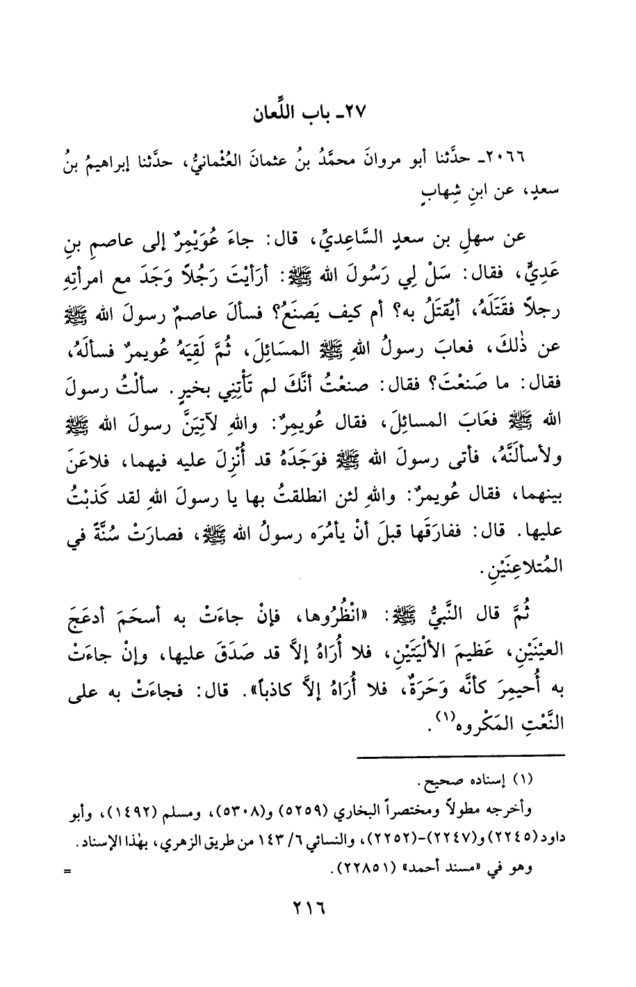 2066- حَدَّثَنَا أَبُو مَرْوَانَ مُحَمَّدُ بْنُ عُثْمَانَ الْعُثْمَانِيُّ ، حَدَّثَنَا إِبْرَاهِيمُ بْنُ سَعْدٍ ، عَنِ ابْنِ شِهَابٍ ، عَنْ سَهْلِ بْنِ سَعْدٍ السَّاعِدِيِّ ، قَالَ : جَاءَ عُوَيْمِرٌ إِلَى عَاصِمِ بْنِ عَدِيٍّ ، فَقَالَ : سَلْ لِي رَسُولَ اللهِ صَلَّى الله عَليْهِ وسَلَّمَ ، أَرَأَيْتَ رَجُلاً وَجَدَ مَعَ امْرَأَتِهِ رَجُلاً فَقَتَلَهُ ، أَيُقْتَلُ بِهِ ؟ أَمْ كَيْفَ يَصْنَعُ ؟ فَسَأَلَ عَاصِمٌ رَسُولَ اللهِ صَلَّى الله عَليْهِ وسَلَّمَ عَنْ ذَلِكَ ، فَعَابَ رَسُولُ اللهِ صَلَّى الله عَليْهِ وسَلَّمَ المَسَائِلَ ، ثُمَّ لَقِيَهُ عُوَيْمِرٌ , فَسَأَلَهُ ، فَقَالَ : مَا صَنَعْتَ ؟ فَقَالَ : صَنَعْتُ أَنَّكَ لَمْ تَأْتِنِي بِخَيْرٍ ، سَأَلْتُ رَسُولَ اللهِ صَلَّى الله عَليْهِ وسَلَّمَ ، فَعَابَ المَسَائِلَ ، فَقَالَ عُوَيْمِرٌ : وَاللَّهِ لآتِيَنَّ رَسُولَ اللهِ صَلَّى الله عَليْهِ وسَلَّمَ وَلأَسْأَلَنَّهُ ، فَأَتَى رَسُولَ اللهِ صَلَّى الله عَليْهِ وسَلَّمَ ، فَوَجَدَهُ قَدْ أُنْزِلَ عَلَيْهِ فِيهِمَا ، فَلاَعَنَ بَيْنَهُمَا ، فَقَالَ عُوَيْمِرٌ : وَاللَّهِ ، لَئِنِ انْطَلَقْتُ بِهَا يَا رَسُولَ اللهِ ، لَقَدْ كَذَبْتُ عَلَيْهَا ، قَالَ : فَفَارَقَهَا قَبْلَ أَنْ يَأْمُرَهُ رَسُولُ اللهِ صَلَّى الله عَليْهِ وسَلَّمَ ، فَصَارَتْ سُنَّةً فِي الْمُتَلاَعِنَيْنِ.