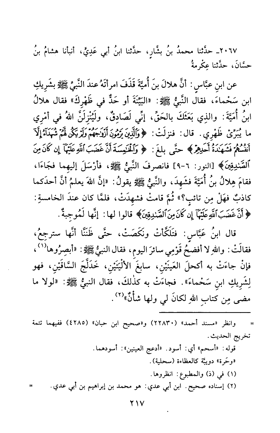 2067- حَدَّثَنَا مُحَمَّدُ بْنُ بَشَّارٍ ، حَدَّثَنَا ابْنُ أَبِي عَدِيٍّ ، أَخْبَرَنَا هِشَامُ بْنُ حَسَّانَ ، حَدَّثَنَا عِكْرِمَةُ ، عَنِ ابْنِ عَبَّاسٍ ، أَنَّ هِلاَلَ بْنَ أُمَيَّةَ قَذَفَ امْرَأَتَهُ عِنْدَ النَّبِيِّ صَلَّى الله عَليْهِ وسَلَّمَ بِشَرِيكِ ابْنِ سَحْمَاءَ ، فَقَالَ النَّبِيُّ صَلَّى الله عَليْهِ وسَلَّمَ : الْبَيِّنَةَ أَوْ حَدٌّ فِي ظَهْرِكَ ، فَقَالَ هِلاَلُ بْنُ أُمَيَّةَ : وَالَّذِي بَعَثَكَ بِالْحَقِّ ، إِنِّي لَصَادِقٌ ، وَلَيُنْزِلَنَّ اللَّهُ فِي أَمْرِي مَا يُبَرِّئُ ظَهْرِي ، قَالَ : فَنَزَلَتْ : {وَالَّذِينَ يَرْمُونَ أَزْوَاجَهُمْ وَلَمْ يَكُنْ لَهُمْ شُهَدَاءُ إِلاَّ أَنْفُسُهُمْ} ، حَتَّى بَلَغَ : {وَالْخَامِسَةَ أَنَّ غَضَبَ اللهِ عَلَيْهَا إِنْ كَانَ مِنَ الصَّادِقِينَ} فَانْصَرَفَ النَّبِيُّ صَلَّى الله عَليْهِ وسَلَّمَ ، فَأَرْسَلَ إِلَيْهِمَا فَجَاءَا ، فَقَامَ هِلاَلُ بْنُ أُمَيَّةَ فَشَهِدَ ، وَالنَّبِيُّ صَلَّى الله عَليْهِ وسَلَّمَ يَقُولُ : إِنَّ اللَّهَ يَعْلَمُ أَنَّ أَحَدَكُمَا كَاذِبٌ ، فَهَلْ مِنْ تَائِبٍ ؟ ثُمَّ قَامَتْ فَشَهِدَتْ ، فَلَمَّا كَانَ عِنْدَ الْخَامِسَةِ : {أَنَّ غَضَبَ اللهِ عَلَيْهَا إِنْ كَانَ مِنَ الصَّادِقِينَ} ، قَالُوا لَهَا : إِنَّهَا لَمُوجِبَةٌ.
