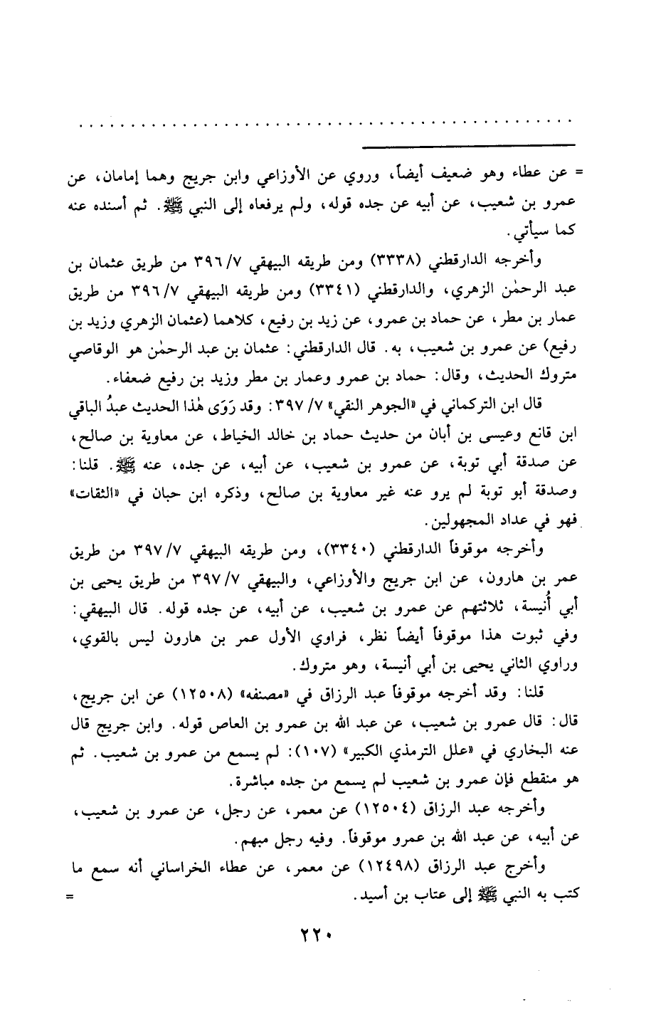 = عن عطاء وهو ضعيف أيضًا، وروي عن الأوزاعي وابن جريج وهما إمامان، عن عمرو بن شعيب، عن أبيه عن جده قوله، ولم يرفعاه إلى النبي - صَلَّى اللَّهُ عَلَيْهِ وَسَلَّمَ -. ثم أسنده عنه كما سيأتي.