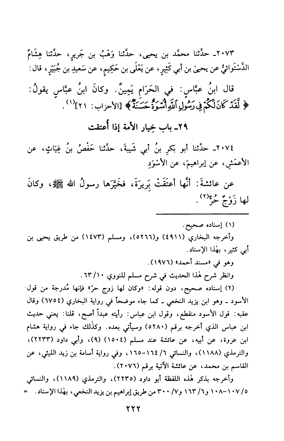 2074- حَدَّثَنَا أَبُو بَكْرِ بْنُ أَبِي شَيْبَةَ ، حَدَّثَنَا حَفْصُ بْنُ غِيَاثٍ ، عَنِ الأَعْمَشِ ، عَنْ إِبْرَاهِيمَ ، عَنِ الأَسْوَدِ ، عَنْ عَائِشَةَ ، أَنَّهَا أَعْتَقَتْ بَرِيرَةَ ، فَخَيَّرَهَا رَسُولُ اللهِ صَلَّى الله عَليْهِ وسَلَّمَ , وَكَانَ لَهَا زَوْجٌ حُرٌّ.