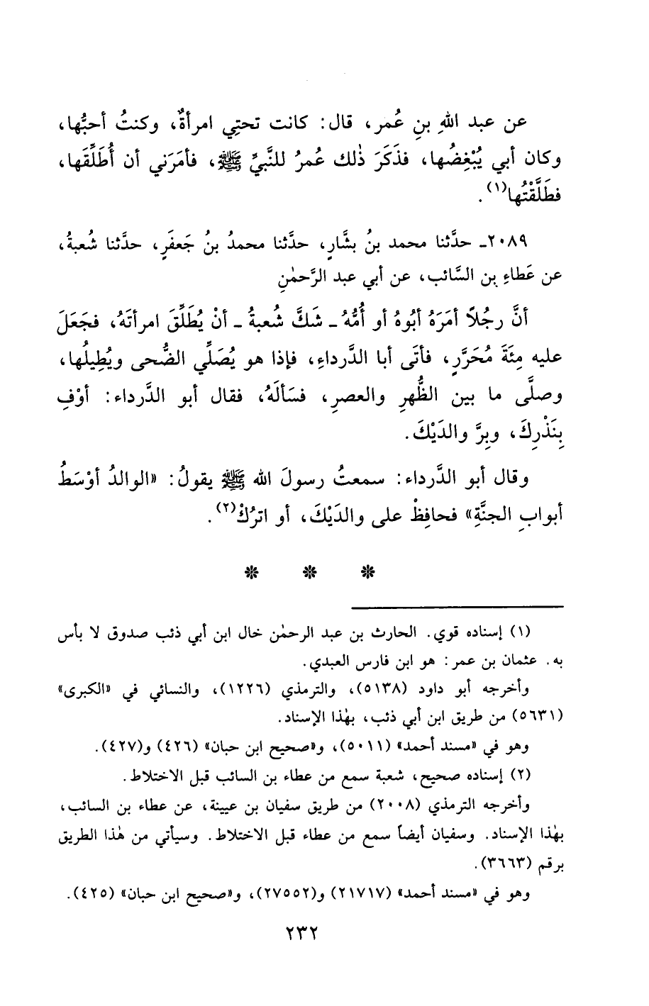 2089- حَدَّثَنَا مُحَمَّدُ بْنُ بَشَّارٍ ، حَدَّثَنَا مُحَمَّدُ بْنُ جَعْفَرٍ ، حَدَّثَنَا شُعْبَةُ ، عَنْ عَطَاءِ بْنِ السَّائِبِ ، عَنْ أَبِي عَبْدِ الرَّحْمَنِ ، أَنَّ رَجُلاً أَمَرَهُ أَبُوهُ أَوْ أُمُّهُ ، شَكَّ شُعْبَةُ ، أَنْ يُطَلِّقَ امْرَأَتَهُ ، فَجَعَلَ عَلَيْهِ مِئَةَ مُحَرَّرٍ ، فَأَتَى أَبَا الدَّرْدَاءِ ، فَإِذَا هُوَ يُصَلِّي الضُّحَى وَيُطِيلُهَا ، وَصَلَّى مَا بَيْنَ الظُّهْرِ وَالْعَصْرِ ، فَسَأَلَهُ ، فَقَالَ أَبُو الدَّرْدَاءِ : أَوْفِ بِنَذْرِكَ ، وَبِرَّ وَالِدَيْكَ.