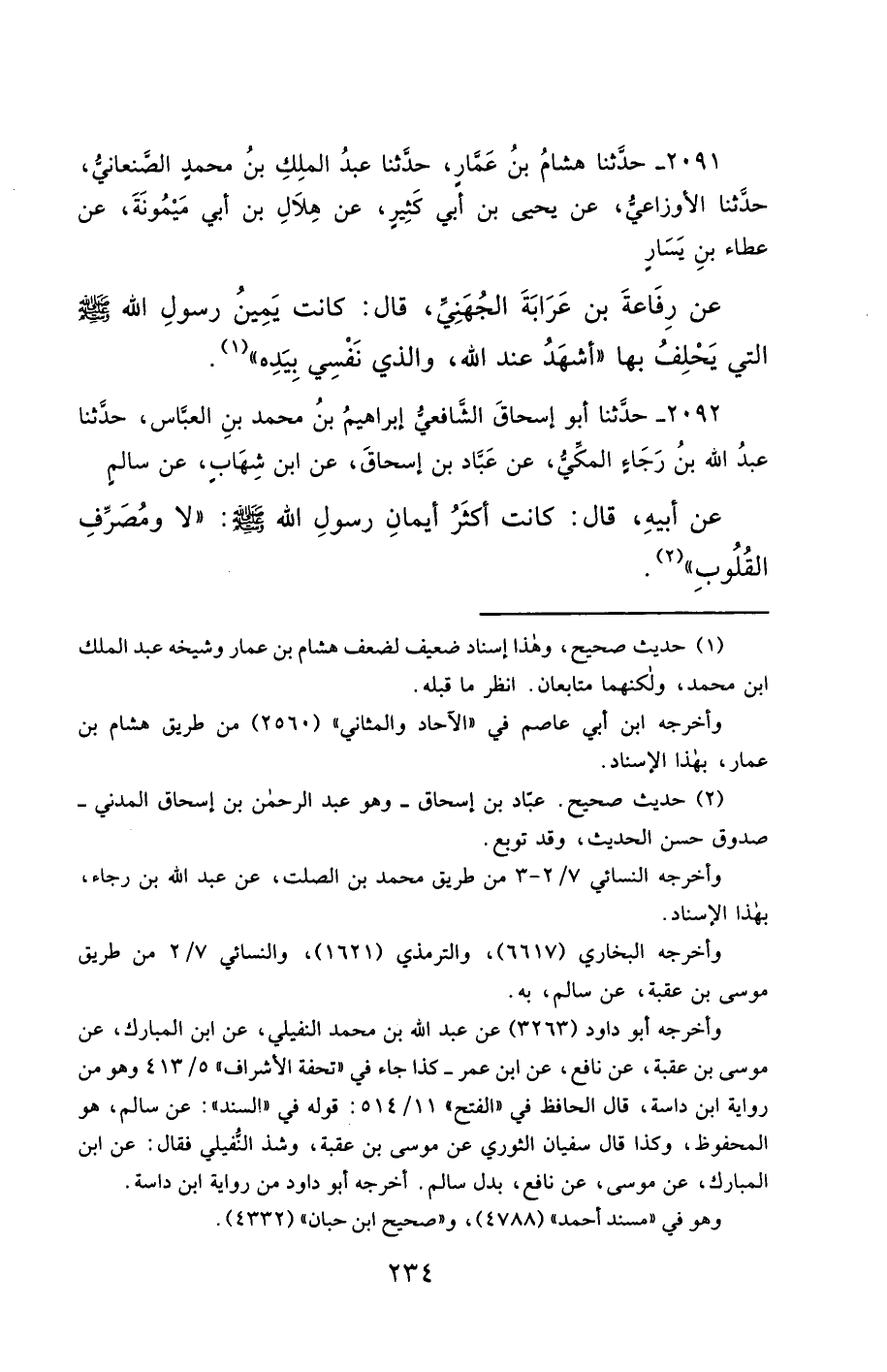 2092- حَدَّثَنَا أَبُو إِسْحَاقَ الشَّافِعِيُّ إِبْرَاهِيمُ بْنُ مُحَمَّدِ بْنِ الْعَبَّاسِ ، حَدَّثَنَا عَبْدُ اللهِ بْنُ رَجَاءٍ الْمَكِّيُّ ، عَنْ عَبَّادِ بْنِ إِسْحَاقَ ، عَنِ ابْنِ شِهَابٍ ، عَنْ سَالِمٍ ، عَنْ أَبِيهِ ، قَالَ : كَانَتْ أَكْثَرُ أَيْمَانِ رَسُولِ اللهِ صَلَّى الله عَليْهِ وسَلَّمَ : لاَ وَمُصَرِّفِ الْقُلُوبِ (1).