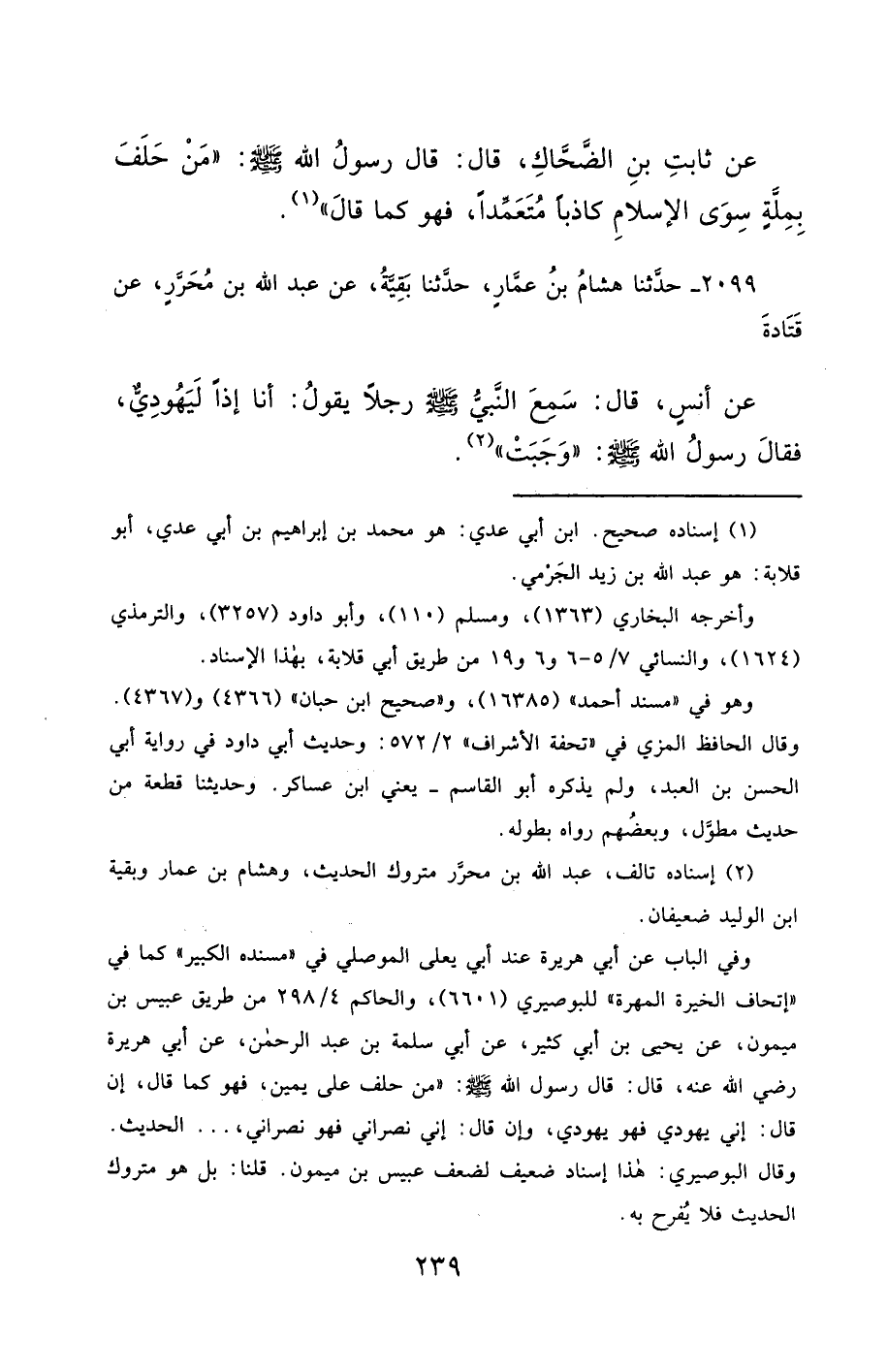 2099- حَدَّثَنَا هِشَامُ بْنُ عَمَّارٍ ، حَدَّثَنَا بَقِيَّةُ ، عَنْ عَبْدِ اللهِ بْنِ مُحَرَّرٍ ، عَنْ قَتَادَةَ ، عَنْ أَنَسٍ ، قَالَ : سَمِعَ النَّبِيُّ صَلَّى الله عَليْهِ وسَلَّمَ رَجُلاً يَقُولُ : أَنَا إِذًا لَيَهُودِيٌّ ، فَقَالَ رَسُولُ اللهِ صَلَّى الله عَليْهِ وسَلَّمَ : وَجَبَتْ.