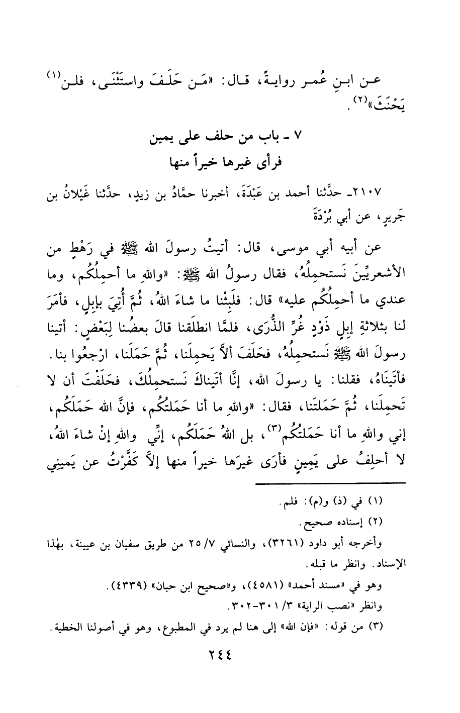 2107- حَدَّثَنَا أَحْمَدُ بْنُ عَبْدَةَ ، أَخْبَرَنَا حَمَّادُ بْنُ زَيْدٍ ، حَدَّثَنَا غَيْلاَنُ بْنُ جَرِيرٍ ، عَنْ أَبِي بُرْدَةَ ، عَنْ أَبِيهِ أَبِي مُوسَى ، قَالَ : أَتَيْتُ رَسُولَ اللهِ صَلَّى الله عَليْهِ وسَلَّمَ فِي رَهْطٍ مِنَ الأَشْعَرِيِّينَ نَسْتَحْمِلُهُ ، فَقَالَ رَسُولُ اللهِ صَلَّى الله عَليْهِ وسَلَّمَ : وَاللَّهِ مَا أَحْمِلُكُمْ وَمَا عِنْدِي مَا أَحْمِلُكُمْ عَلَيْهِ , قَالَ : فَلَبِثْنَا مَا شَاءَ اللَّهُ ، ثُمَّ أُتِيَ بِإِبِلٍ ، فَأَمَرَ لَنَا بِثَلاَثَةِ إِبِلٍ ذَوْدٍ غُرِّ الذُّرَى ، فَلَمَّا انْطَلَقْنَا ، قَالَ بَعْضُنَا لِبَعْضٍ : أَتَيْنَا رَسُولَ اللهِ صَلَّى الله عَليْهِ وسَلَّمَ نَسْتَحْمِلُهُ ، فَحَلَفَ أَلاَّ يَحْمِلَنَا ، ثُمَّ حَمَلَنَا ، ارْجِعُوا بِنَا ، فَأَتَيْنَاهُ ، فَقُلْنَا : يَا رَسُولَ اللهِ ، إِنَّا أَتَيْنَاكَ نَسْتَحْمِلُكَ , فَحَلَفْتَ أَنْ لاَ تَحْمِلَنَا ، ثُمَّ حَمَلْتَنَا ، فَقَالَ : وَاللَّهِ مَا أَنَا حَمَلْتُكُمْ ، فَإِنَّ اللَّهُ حَمَلَكُمْ ، إِنِّي وَاللَّهِ مَا أَنَا حَمَلْتُكُمْ ، بَلِ اللَّهُ حَمَلَكُمْ ، إِنِّي وَاللهِ إِنْ شَاءَ اللَّهُ ، لاَ أَحْلِفُ عَلَى يَمِينٍ ، فَأَرَى غَيْرَهَا خَيْرًا مِنْهَا , إِلاَّ كَفَّرْتُ عَنْ يَمِينِي ، وَأَتَيْتُ الَّذِي هُوَ خَيْرٌ ، أَوْ قَالَ : أَتَيْتُ الَّذِي هُوَ خَيْرٌ ، وَكَفَّرْتُ عَنْ يَمِينِي.