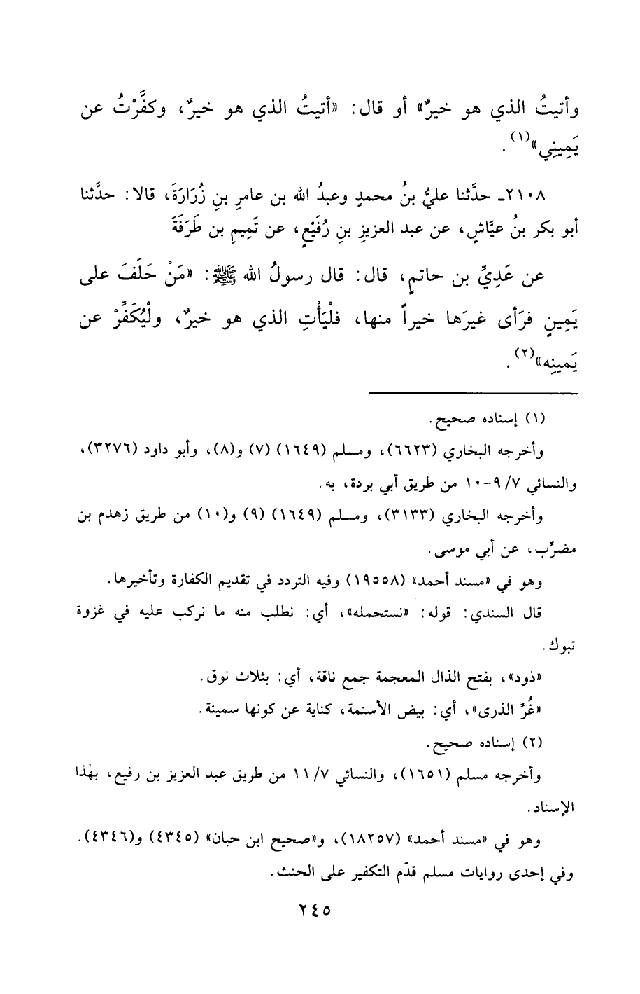 2108- حَدَّثَنَا عَلِيُّ بْنُ مُحَمَّدٍ ، وَعَبْدُ اللهِ بْنُ عَامِرِ بْنِ زُرَارَةَ ، قَالاَ : حَدَّثَنَا أَبُو بَكْرِ بْنُ عَيَّاشٍ ، عَنْ عَبْدِ الْعَزِيزِ بْنِ رُفَيْعٍ ، عَنْ تَمِيمِ بْنِ طَرَفَةَ ، عَنْ عَدِيِّ بْنِ حَاتِمٍ ، قَالَ : قَالَ رَسُولُ اللهِ صَلَّى الله عَليْهِ وسَلَّمَ : مَنْ حَلَفَ عَلَى يَمِينٍ فَرَأَى غَيْرَهَا خَيْرًا مِنْهَا ، فَلْيَأْتِ الَّذِي هُوَ خَيْرٌ ، وَلْيُكَفِّرْ عَنْ يَمِينِهِ.