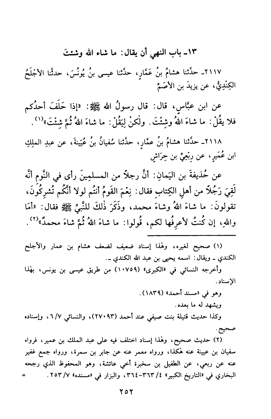 2118- حَدَّثَنَا هِشَامُ بْنُ عَمَّارٍ ، حَدَّثَنَا سُفْيَانُ بْنُ عُيَيْنَةَ ، عَنْ عَبْدِ الْمَلِكِ بْنِ عُمَيْرٍ ، عَنْ رِبْعِيِّ بْنِ حِرَاشٍ ، عَنْ حُذَيْفَةَ بْنِ الْيَمَانِ ، أَنَّ رَجُلاً مِنَ الْمُسْلِمِينَ رَأَى فِي النَّوْمِ أَنَّهُ لَقِيَ رَجُلاً مِنْ أَهْلِ الْكِتَابِ ، فَقَالَ : نِعْمَ الْقَوْمُ أَنْتُمْ لَوْلاَ أَنَّكُمْ تُشْرِكُونَ ، تَقُولُونَ : مَا شَاءَ اللَّهُ وَشَاءَ مُحَمَّدٌ ، وَذَكَرَ ذَلِكَ لِلنَّبِيِّ صَلَّى الله عَليْهِ وسَلَّمَ ، فَقَالَ : أَمَا وَاللَّهِ ، إِنْ كُنْتُ لأَعْرِفُهَا لَكُمْ ، قُولُوا : مَا شَاءَ اللَّهُ ، ثُمَّ شَاءَ مُحَمَّدٌ.
