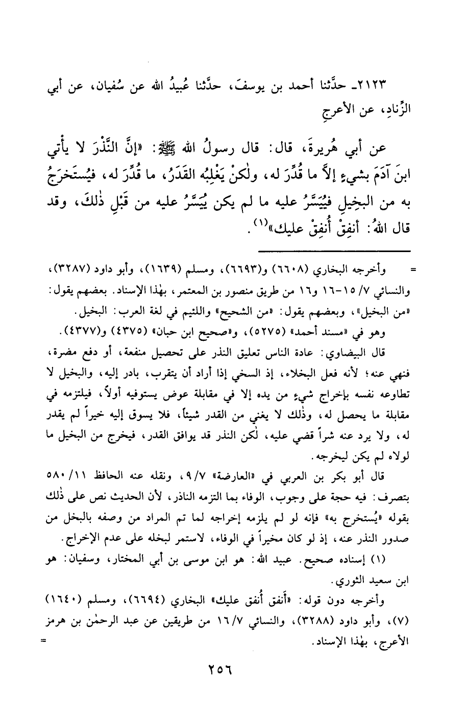 2123- حَدَّثَنَا أَحْمَدُ بْنُ يُوسُفَ ، حَدَّثَنَا عُبَيْدُ اللهِ ، عَنْ سُفْيَانَ ، عَنْ أَبِي الزِّنَادِ ، عَنِ الأَعْرَجِ ، عَنْ أَبِي هُرَيْرَةَ ، قَالَ : قَالَ رَسُولُ اللهِ صَلَّى الله عَليْهِ وسَلَّمَ : إِنَّ النَّذْرَ لاَ يَأْتِي ابْنَ آدَمَ بِشَيْءٍ إِلاَّ مَا قُدِّرَ لَهُ ، وَلَكِنْ يَغْلِبُهُ الْقَدَرُ مَا قُدِّرَ لَهُ ، فَيُسْتَخْرَجُ بِهِ مِنَ الْبَخِيلِ , فَيُيَسَّرُ عَلَيْهِ مَا لَمْ يَكُنْ يُيَسَّرُ عَلَيْهِ مِنْ قَبْلِ ذَلِكَ ، وَقَدْ قَالَ اللَّهُ : أَنْفِقْ أُنْفِقْ عَلَيْكَ.
