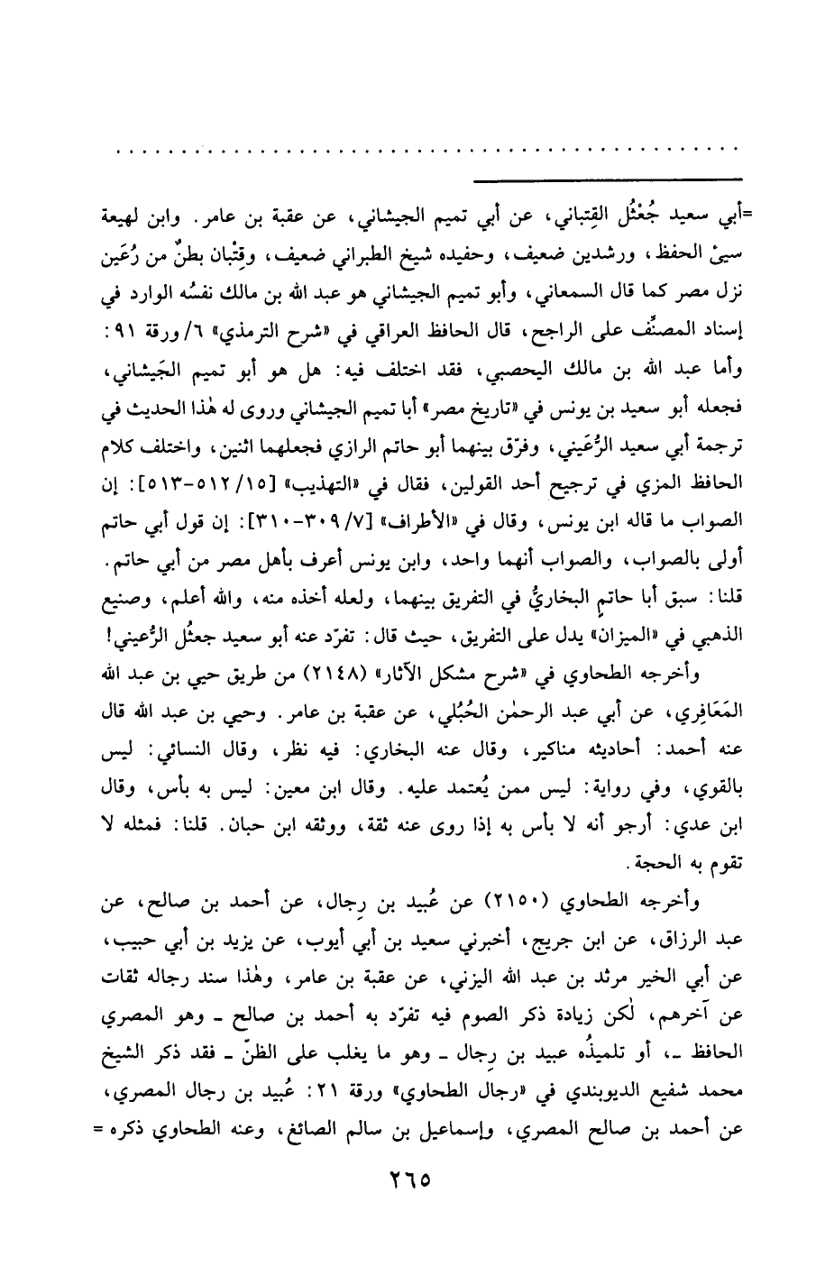 = أبي سعيد جُعْثُل القِتباني، عن أبي تميم الجيشاني، عن عقبة بن عامر. وابن لهيعة سيئ الحفظ، ورشدين ضعيف، وحفيده شيخ الطبراني ضعيف، وقِتْبان بطنٌ من رُعَين نزل مصر كما قال السمعاني، وأبو تميم الجيشاني هو عبد الله بن مالك نفسُه الوارد في إسناد المصنف على الراجح، قال الحافظ العراقي في "شرح الترمذي" 6/ ورقة 91: وأما عبد الله بن مالك اليحصبي، فقد اختلف فيه: هل هو أبو تميم الجَيشاني، فجعله أبو سعيد بن يونس في "تاريخ مصر" أبا تميم الجيشاني وروى له هذا الحديث في ترجمة أبي سعيد الرُّعَيني، وفرق بينهما أبو حاتم الرازي فجعلهما اثنين، واختلف كلام الحافظ المزي في ترجيح أحد القولين، فقال في "التهذيب" [15/ 512 - 513]: إن الصواب ما قاله ابن يونس، وقال في "الأطراف" [71/ 309 - 310]: إن قول أبي حاتم أولى بالصواب، والصواب أنهما واحد، وابن يونس أعرف بأهل مصر من أبي حاتم. قلنا: سبق أبا حاتمِ البخاري في التفريق بينهما، ولعله أخذه منه، والله أعلم، وصنيع الذهبي في "الميزان" يدل على التفريق، حيث قال: تفرّد عنه أبو سعيد جعثُل الرُّعيني!