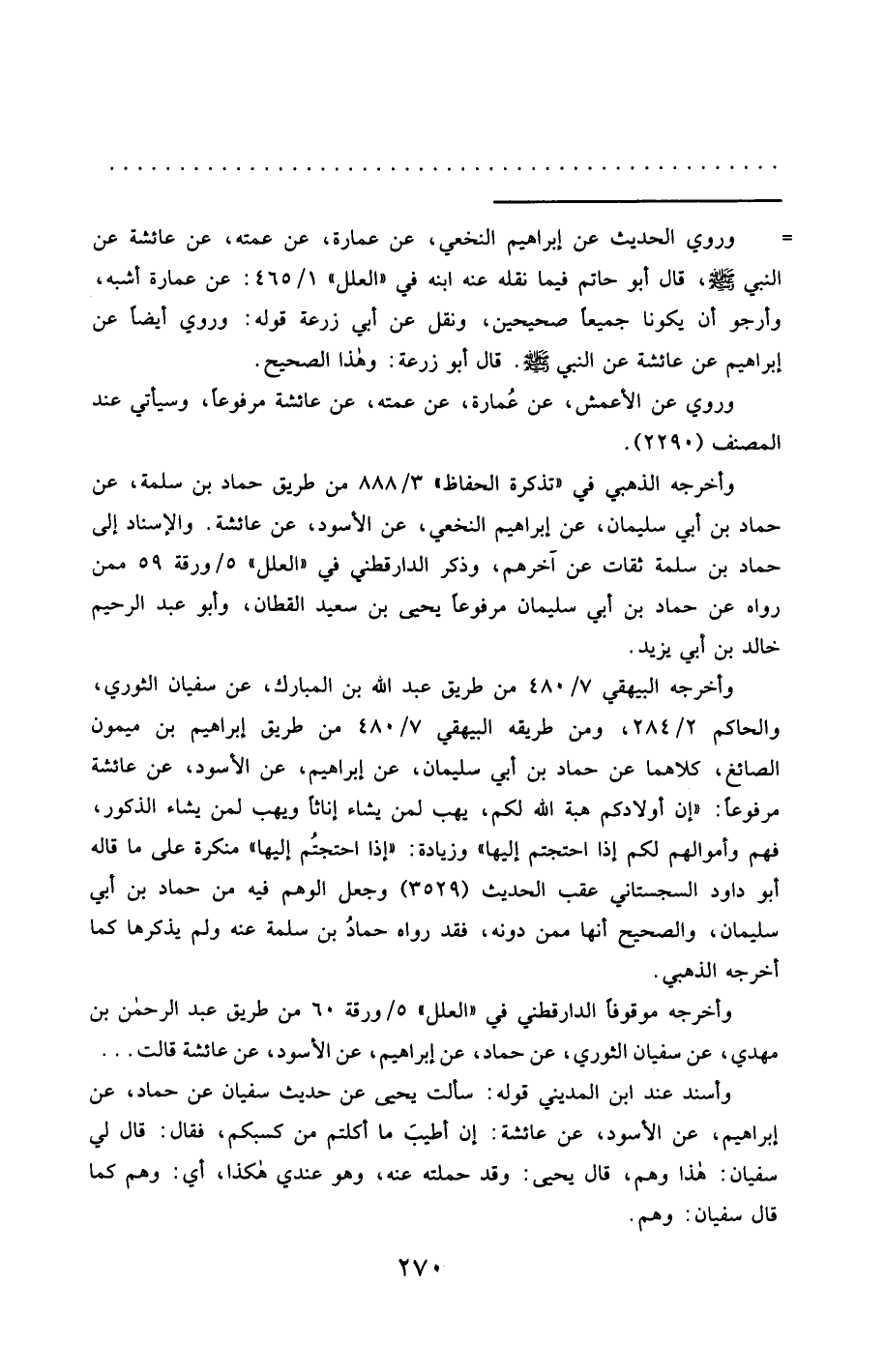 = وروي الحديث عن إبراهيم النخعي، عن عمارة، عن عمته، عن عائشة عن النبي - صَلَّى اللَّهُ عَلَيْهِ وَسَلَّمَ -، قال أبو حاتم فيما نقله عنه ابنه في "العلل" 1/ 465: عن عمارة أشبه، وأرجو أن يكونا جميعًا صحيحين، ونقل عن أبي زرعة قوله: وروي أيضًا عن إبراهيم عن عائشة عن النبي - صَلَّى اللَّهُ عَلَيْهِ وَسَلَّمَ -. قال أبو زرعة: وهذا الصحيح.