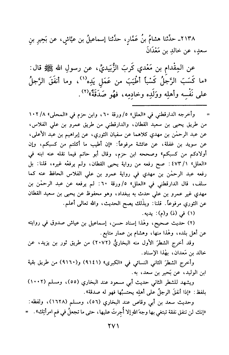 2138- حَدَّثَنَا هِشَامُ بْنُ عَمَّارٍ ، حَدَّثَنَا إِسْمَاعِيلُ بْنُ عَيَّاشٍ ، عَنْ بَحِيرِ بْنِ سَعْدٍ ، عَنْ خَالِدِ بْنِ مَعْدَانَ ، عَنِ الْمِقْدَامِ بْنِ مَعْدِي كَرِبَ الزُّبَيْدِيِّ ، عَنْ رَسُولِ اللهِ صَلَّى الله عَليْهِ وسَلَّمَ قَالَ : مَا كَسَبَ الرَّجُلُ كَسْبًا أَطْيَبَ مِنْ عَمَلِ يَدِهِ ، وَمَا أَنْفَقَ الرَّجُلُ عَلَى نَفْسِهِ وَأَهْلِهِ وَوَلَدِهِ وَخَادِمِهِ ، فَهُوَ صَدَقَةٌ.
