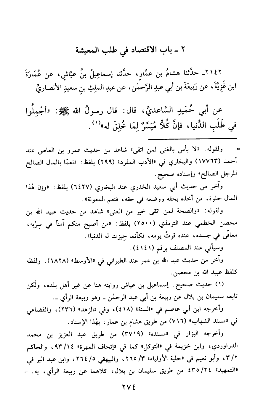 2142- حَدَّثَنَا هِشَامُ بْنُ عَمَّارٍ ، حَدَّثَنَا إِسْمَاعِيلُ بْنُ عَيَّاشٍ ، عَنْ عُمَارَةَ بْنِ غَزِيَّةَ ، عَنْ رَبِيعَةَ بْنِ أَبِي عَبْدِ الرَّحْمَنِ ، عَنْ عَبْدِ الْمَلِكِ بْنِ سَعِيدٍ الأَنْصَارِيِّ ، عَنْ أَبِي حُمَيْدٍ السَّاعِدِيِّ ، قَالَ : قَالَ رَسُولُ اللهِ صَلَّى الله عَليْهِ وسَلَّمَ : أَجْمِلُوا فِي طَلَبِ الدُّنْيَا ، فَإِنَّ كُلاًّ مُيَسَّرٌ لِمَا خُلِقَ لَهُ.