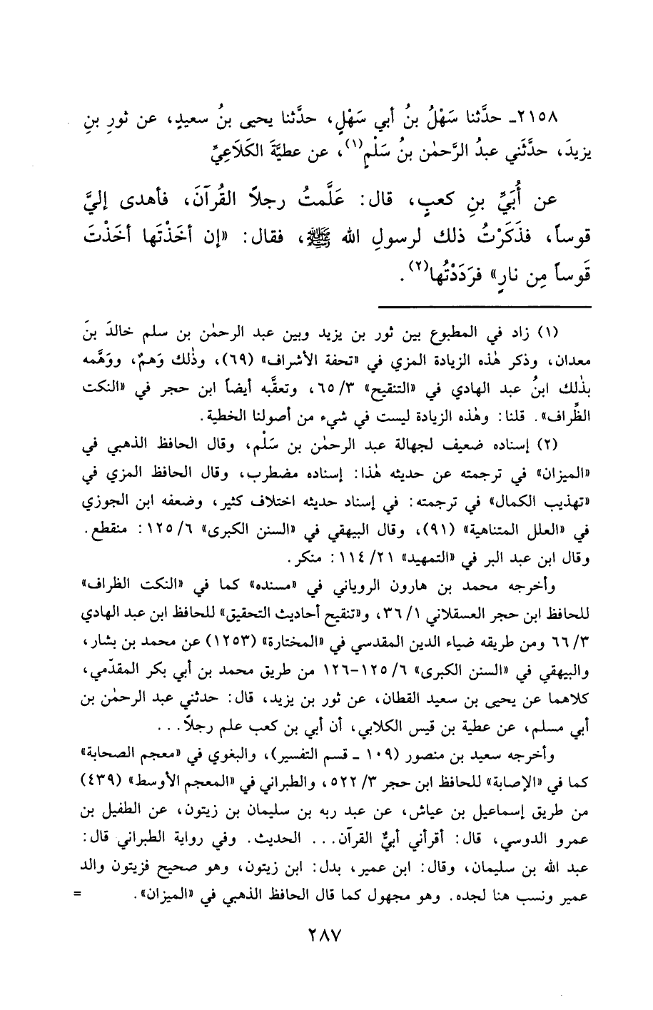 2158- حَدَّثَنَا سَهْلُ بْنُ أَبِي سَهْلٍ ، حَدَّثَنَا يَحْيَى بْنُ سَعِيدٍ ، عَنْ ثَوْرِ بْنِ يَزِيدَ , حَدَّثَنِي عَبْدُ الرَّحْمَنِ بْنُ سَلْمٍ ، عَنْ عَطِيَّةَ الْكَلاَعِيِّ ، عَنْ أُبَيِّ بْنِ كَعْبٍ ، قَالَ : عَلَّمْتُ رَجُلاً الْقُرْآنَ ، فَأَهْدَى إِلَيَّ قَوْسًا ، فَذَكَرْتُ ذَلِكَ لِرَسُولِ اللهِ صَلَّى الله عَليْهِ وسَلَّمَ ، فَقَالَ : إِنْ أَخَذْتَهَا أَخَذْتَ قَوْسًا مِنْ نَارٍ ، فَرَدَدْتُهَا.