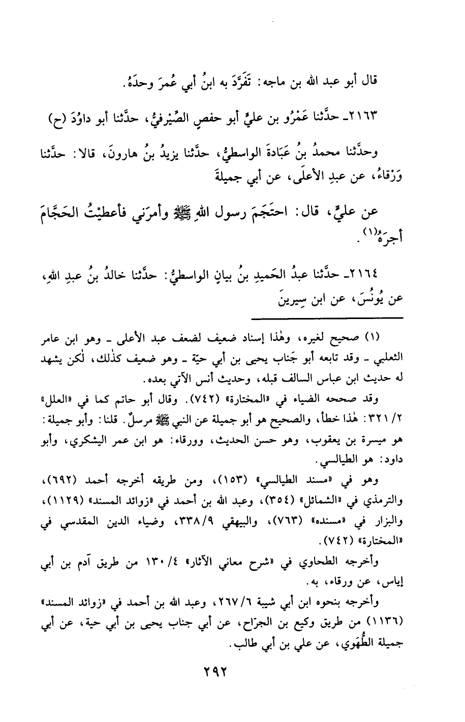 2163- حَدَّثَنَا عَمْرُو بْنُ عَلِيٍّ أَبُو حَفْصٍ الصَّيْرَفِيُّ ، حَدَّثَنَا أَبُو دَاوُدَ (ح) وحَدَّثَنَا مُحَمَّدُ بْنُ عَبَادَةَ (1)، الْوَاسِطِيُّ ، حَدَّثَنَا يَزِيدُ بْنُ هَارُونَ ، قَالاَ : حَدَّثَنَا وَرْقَاءُ ، عَنْ عَبْدِ الأَعْلَى ، عَنْ أَبِي جَمِيلَةَ ، عَنْ عَلِيٍّ ، قَالَ : احْتَجَمَ رَسُولُ اللهِ صَلَّى الله عَليْهِ وسَلَّمَ ، وَأَمَرَنِي فَأَعْطَيْتُ الْحَجَّامَ أَجْرَهُ.