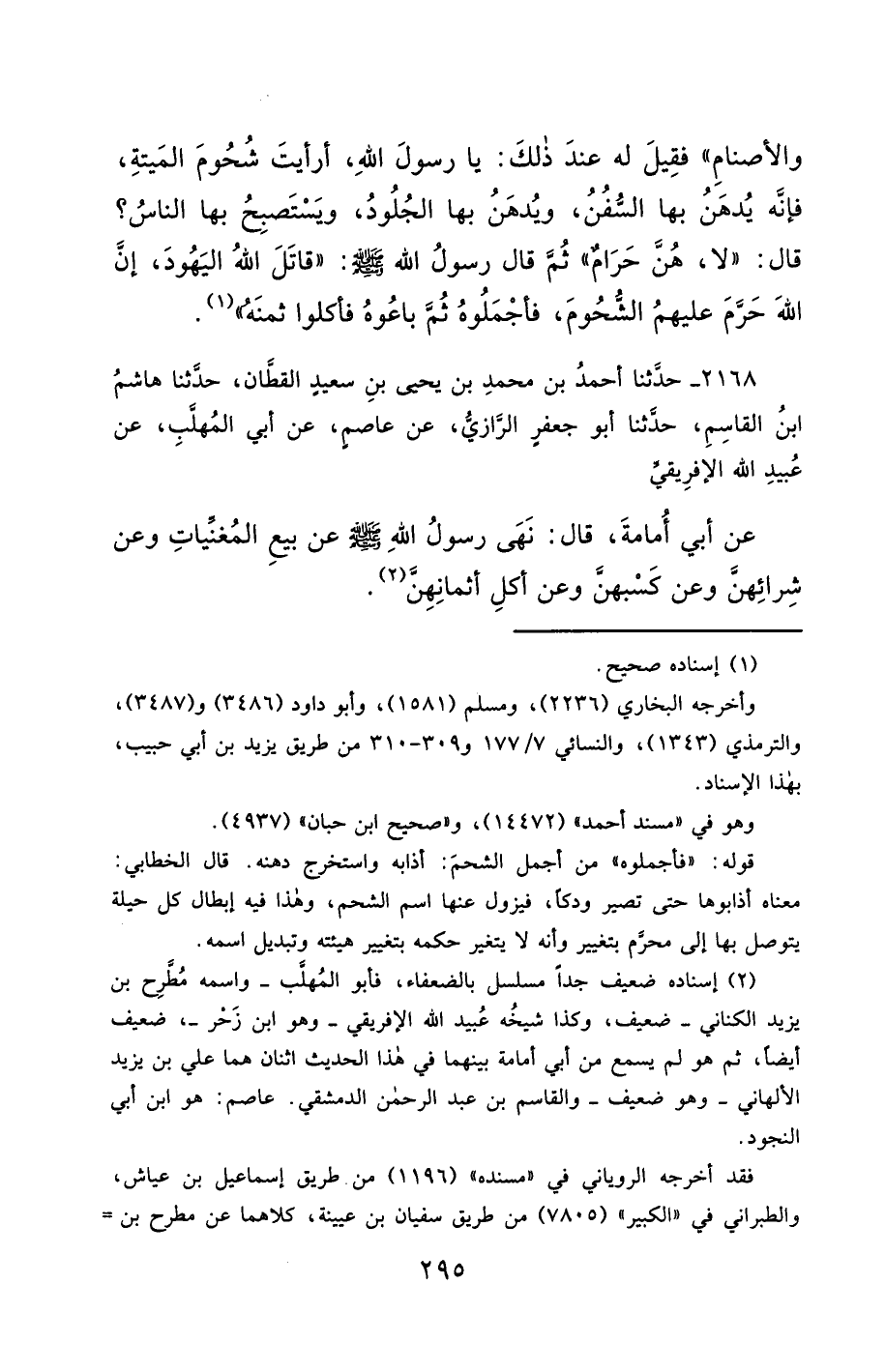 2168- حَدَّثَنَا أَحْمَدُ بْنُ مُحَمَّدِ بْنِ يَحْيَى بْنِ سَعِيدٍ الْقَطَّانِ ، حَدَّثَنَا هَاشِمُ بْنُ الْقَاسِمِ ، حَدَّثَنَا أَبُو جَعْفَرٍ الرَّازِيُّ ، عَنْ عَاصِمٍ ، عَنْ أَبِي الْمُهَلَّبِ ، عَنْ عُبَيْدِ اللهِ الإِفْرِيقِيِّ ، عَنْ أَبِي أُمَامَةَ ، قَالَ : نَهَى رَسُولُ اللهِ صَلَّى الله عَليْهِ وسَلَّمَ عَنْ بَيْعِ الْمُغَنِّيَاتِ ، وَعَنْ شِرَائِهِنَّ ، وَعَنْ كَسْبِهِنَّ ، وَعَنْ أَكْلِ أَثْمَانِهِنَّ.