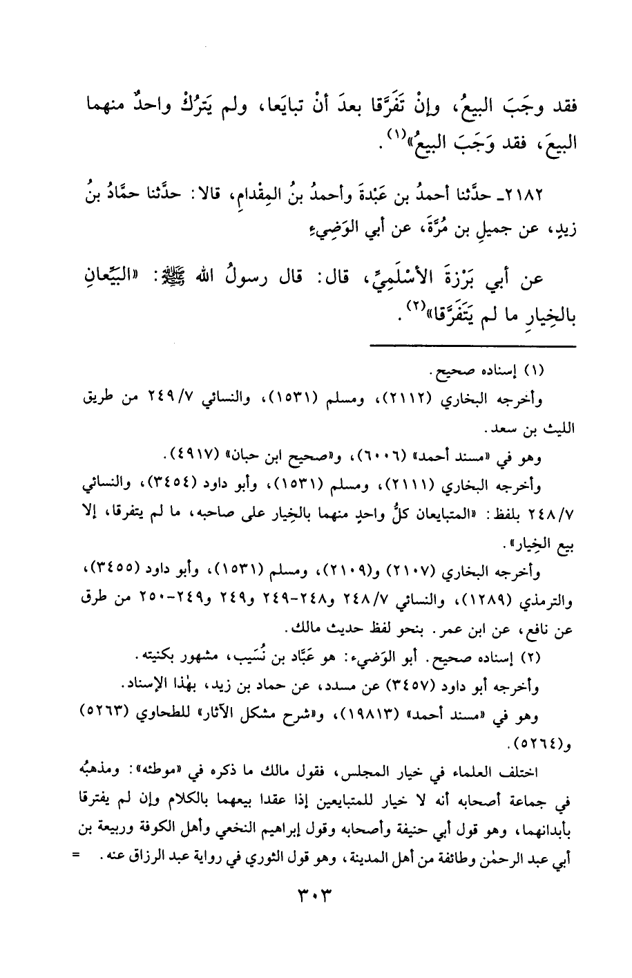2182- حَدَّثَنَا أَحْمَدُ بْنُ عَبْدَةَ ، وَأَحْمَدُ بْنُ الْمِقْدَامِ ، قَالاَ : حَدَّثَنَا حَمَّادُ بْنُ زَيْدٍ ، عَنْ جَمِيلِ بْنِ مُرَّةَ ، عَنْ أَبِي الْوَضِيءِ ، عَنْ أَبِي بَرْزَةَ الأَسْلَمِيِّ ، قَالَ : قَالَ رَسُولُ اللهِ صَلَّى الله عَليْهِ وسَلَّمَ : الْبَيِّعَانِ بِالْخِيَارِ مَا لَمْ يَتَفَرَّقَا.