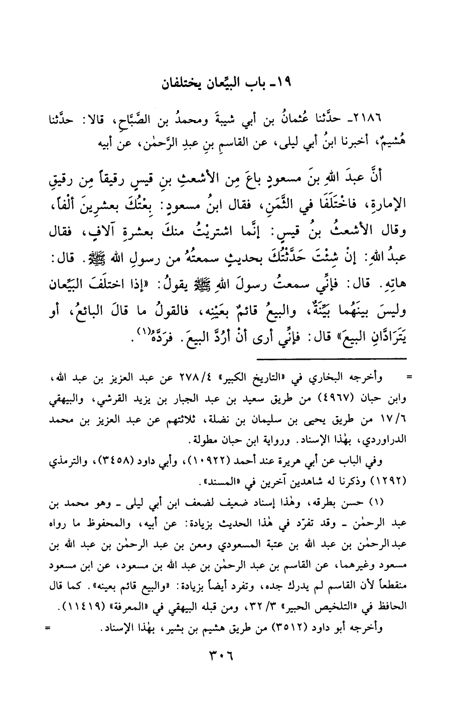 2186- حَدَّثَنَا عُثْمَانُ بْنُ أَبِي شَيْبَةَ ، وَمُحَمَّدُ بْنُ الصَّبَّاحِ ، قَالاَ : حَدَّثَنَا هُشَيْمٌ ، أَخْبَرَنَا ابْنُ أَبِي لَيْلَى ، عَنِ الْقَاسِمِ بْنِ عَبْدِ الرَّحْمَنِ ، عَنْ أَبِيهِ , أَنَّ عَبْدَ اللهِ بْنَ مَسْعُودٍ بَاعَ مِنَ الأَشْعَثِ بْنِ قَيْسٍ رَقِيقًا مِنْ رَقِيقِ الإِمَارَةِ ، فَاخْتَلَفَا فِي الثَّمَنِ ، فَقَالَ ابْنُ مَسْعُودٍ : بِعْتُكَ بِعِشْرِينَ أَلْفًا ، وَقَالَ الأَشْعَثُ بْنُ قَيْسٍ : إِنَّمَا اشْتَرَيْتُ مِنْكَ بِعَشَرَةِ آلاَفٍ ، فَقَالَ عَبْدُ اللهِ : إِنْ شِئْتَ حَدَّثْتُكَ بِحَدِيثٍ سَمِعْتُهُ مِنْ رَسُولِ اللهِ صَلَّى الله عَليْهِ وسَلَّمَ ، قَالَ : هَاتِهِ ، قَالَ : فَإِنِّي سَمِعْتُ رَسُولَ اللهِ صَلَّى الله عَليْهِ وسَلَّمَ يَقُولُ : إِذَا اخْتَلَفَ الْبَيِّعَانِ ، وَلَيْسَ بَيْنَهُمَا بَيِّنَةٌ ، وَالْبَيْعُ قَائِمٌ بِعَيْنِهِ ، فَالْقَوْلُ مَا قَالَ الْبَائِعُ ، أَوْ يَتَرَادَّانِ الْبَيْعَ ، قَالَ : فَإِنِّي أَرَى أَنْ أَرُدَّ الْبَيْعَ ، فَرَدَّهُ.