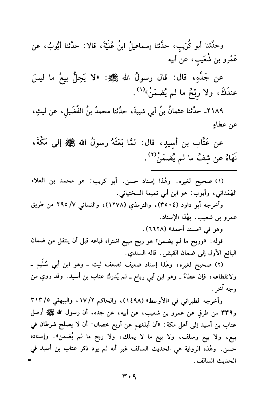 2189- حَدَّثَنَا عُثْمَانُ بْنُ أَبِي شَيْبَةَ ، حَدَّثَنَا مُحَمَّدُ بْنُ الْفُضَيْلِ ، عَنْ لَيْثٍ ، عَنْ عَطَاءٍ ، عَنْ عَتَّابِ بْنِ أَسِيدٍ ، قَالَ : لَمَّا بَعَثَهُ رَسُولُ اللهِ صَلَّى الله عَليْهِ وسَلَّمَ إِلَى مَكَّةَ ، نَهَاهُ عَنْ شِفِّ مَا لَمْ يُضْمَنْ.