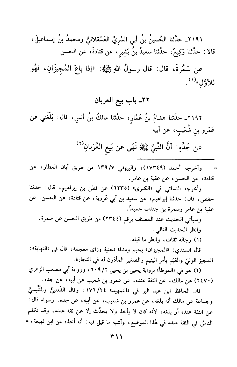 2191- حَدَّثَنَا الْحُسَيْنُ بْنُ أَبِي السَّرِيِّ الْعَسْقَلاَنِيُّ ، وَمُحَمَّدُ بْنُ إِسْمَاعِيلَ ، قَالاَ : حَدَّثَنَا وَكِيعٌ ، حَدَّثَنَا سَعِيدُ بْنُ بَشِيرٍ ، عَنْ قَتَادَةَ ، عَنِ الْحَسَنِ ، عَنْ سَمُرَةَ ، قَالَ : قَالَ رَسُولُ اللهِ صَلَّى الله عَليْهِ وسَلَّمَ : إِذَا بَاعَ الْمُجِيزَانِ فَهُوَ لِلأَوَّلِ.