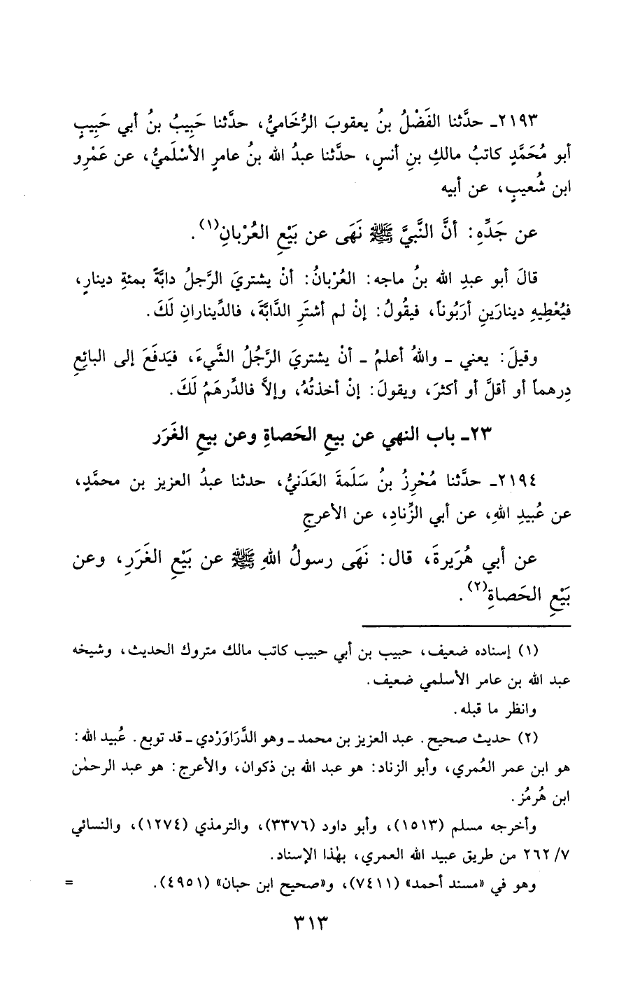 2193- حَدَّثَنَا الْفَضْلُ بْنُ يَعْقُوبَ الرُّخَامِيُّ ، حَدَّثَنَا حَبِيبُ بْنُ أَبِي حَبِيبٍ أَبُو مُحَمَّدٍ ، كَاتِبُ مَالِكِ بْنِ أَنَسٍ ، حَدَّثَنَا عَبْدُ اللهِ بْنُ عَامِرٍ الأَسْلَمِيُّ ، عَنْ عَمْرِو بْنِ شُعَيْبٍ ، عَنْ أَبِيهِ ، عَنْ جَدِّهِ ، أَنَّ النَّبِيَّ صَلَّى الله عَليْهِ وسَلَّمَ نَهَى عَنْ بَيْعِ الْعُرْبَانِ.