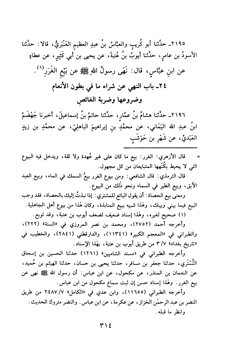 2195- حَدَّثَنَا أَبُو كُرَيْبٍ ، وَالْعَبَّاسُ بْنُ عَبْدِ الْعَظِيمِ الْعَنْبَرِيُّ ، قَالاَ : حَدَّثَنَا الأَسْوَدُ بْنُ عَامِرٍ ، حَدَّثَنَا أَيُّوبُ بْنُ عُتْبَةَ ، عَنْ يَحْيَى بْنِ أَبِي كَثِيرٍ ، عَنْ عَطَاءٍ ، عَنِ ابْنِ عَبَّاسٍ ، قَالَ : نَهَى رَسُولُ اللهِ صَلَّى الله عَليْهِ وسَلَّمَ عَنْ بَيْعِ الْغَرَرِ.