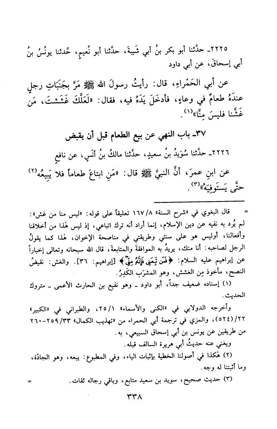 2225- حَدَّثَنَا أَبُو بَكْرِ بْنُ أَبِي شَيْبَةَ ، حَدَّثَنَا أَبُو نُعَيْمٍ ، حَدَّثَنَا يُونُسُ بْنُ أَبِي إِسْحَاقَ ، عَنْ أَبِي دَاوُدَ ، عَنْ أَبِي الْحَمْرَاءِ ، قَالَ : رَأَيْتُ رَسُولَ اللهِ صَلَّى الله عَليْهِ وسَلَّمَ مَرَّ بِجَنَبَاتِ رَجُلٍ عِنْدَهُ طَعَامٌ فِي وِعَاءٍ ، فَأَدْخَلَ يَدَهُ فِيهِ ، فَقَالَ : لَعَلَّكَ غَشَشْتَ ، مَنْ غَشَّنَا فَلَيْسَ مِنَّا.