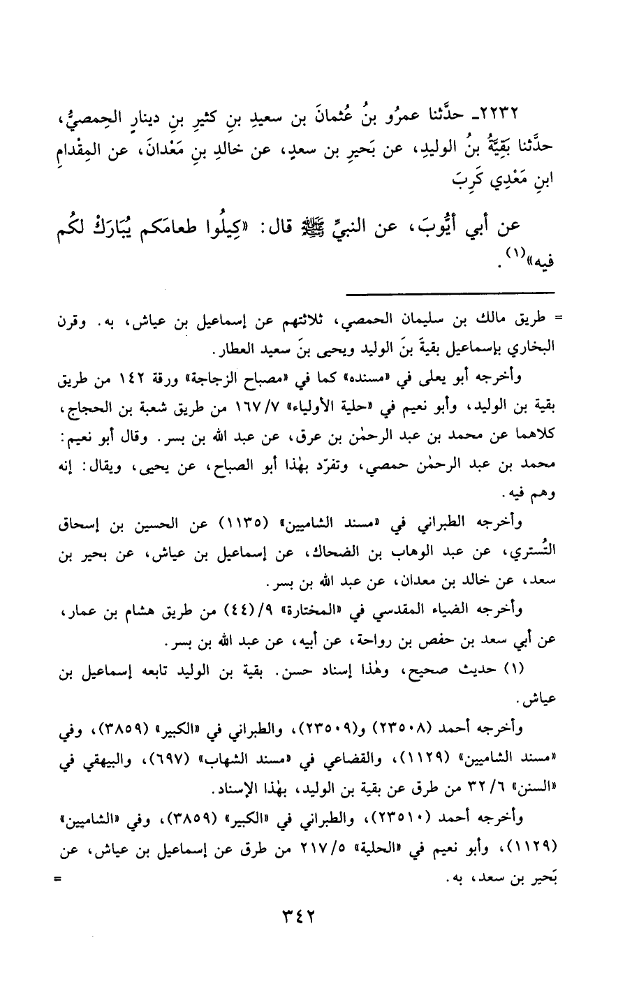 2232- حَدَّثَنَا عَمْرُو بْنُ عُثْمَانَ بْنِ سَعِيدِ بْنِ كَثِيرِ بْنِ دِينَارٍ الْحِمْصِيُّ ، حَدَّثَنَا بَقِيَّةُ بْنُ الْوَلِيدِ ، عَنْ بَحِيرِ بْنِ سَعْدٍ ، عَنْ خَالِدِ بْنِ مَعْدَانَ ، عَنِ الْمِقْدَامِ بْنِ مَعْدِي كَرِبَ ، عَنْ أَبِي أَيُّوبَ ، عَنِ النَّبِيِّ صَلَّى الله عَليْهِ وسَلَّمَ قَالَ : كِيلُوا طَعَامَكُمْ يُبَارَكْ لَكُمْ فِيهِ.