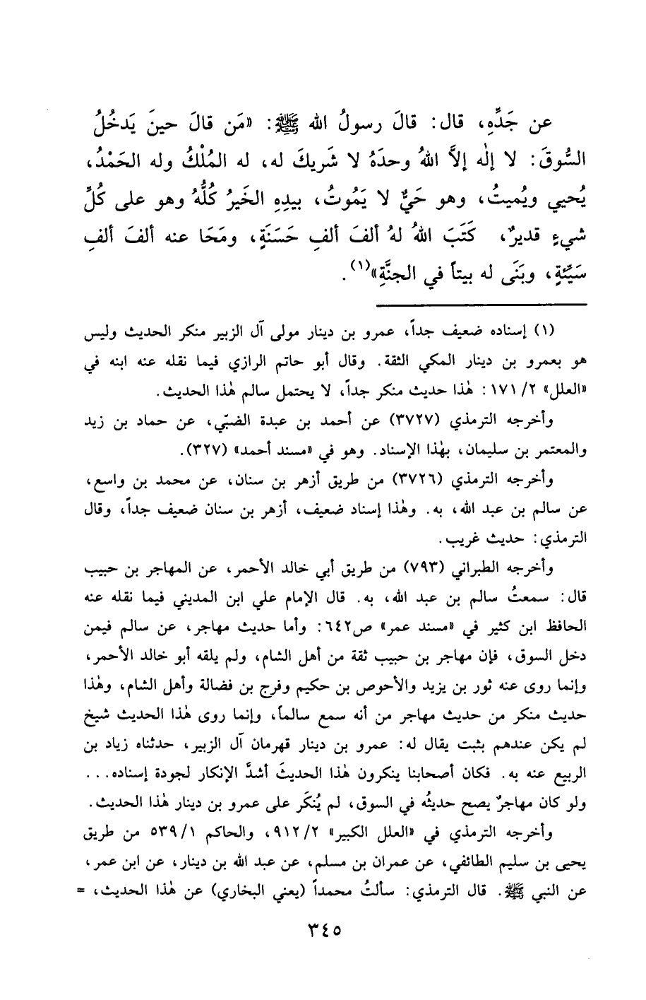 عَنْ جَدِّهِ، قَالَ: قَالَ رَسُولُ اللَّهِ - صَلَّى اللَّهُ عَلَيْهِ وَسَلَّمَ -: "مَنْ قَالَ حِينَ يَدْخُلُ السُّوقَ: لَا إِلَهَ إِلَّا اللَّهُ وَحْدَهُ لَا شَرِيكَ لَهُ، لَهُ الْمُلْكُ وَلَهُ الْحَمْدُ، يُحْيِي وَيُمِيتُ، وَهُوَ حَيٌّ لَا يَمُوتُ، بِيَدِهِ الْخَيْرُ كُلُّهُ وَهُوَ عَلَى كُلِّ شَيْءٍ قَدِيرٌ، كَتَبَ اللَّهُ لَهُ أَلْفَ أَلْفِ حَسَنَةٍ، وَمَحَا عَنْهُ أَلْفَ أَلْفِ سَيِّئَةٍ، وَبَنَى لَهُ بَيْتًا فِي الْجَنَّةِ" (¬1).
