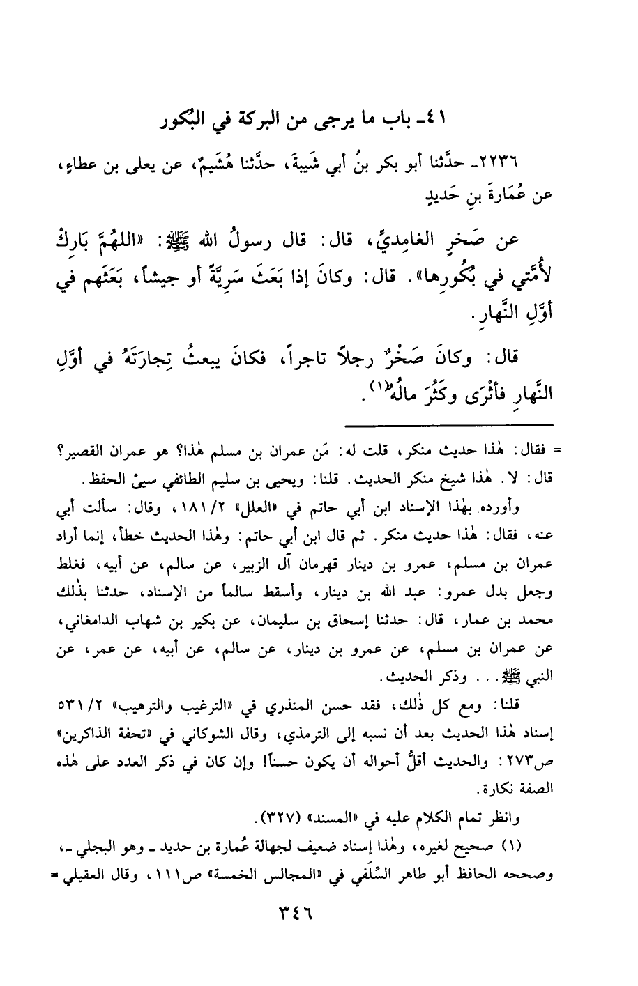 2236- حَدَّثَنَا أَبُو بَكْرِ بْنُ أَبِي شَيْبَةَ ، حَدَّثَنَا هُشَيْمٌ ، عَنْ يَعْلَى بْنِ عَطَاءٍ ، عَنْ عُمَارَةَ بْنِ حَدِيدٍ ، عَنْ صَخْرٍ الْغَامِدِيِّ ، قَالَ : قَالَ رَسُولُ اللهِ صَلَّى الله عَليْهِ وسَلَّمَ : اللَّهُمَّ بَارِكْ لأُمَّتِي فِي بُكُورِهَا.