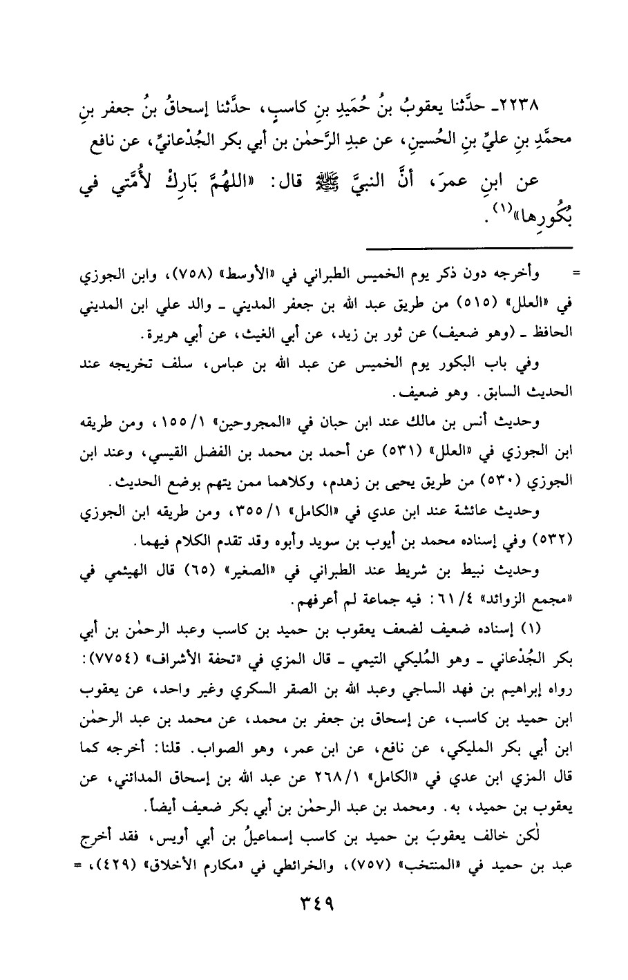 2238- حَدَّثَنَا يَعْقُوبُ بْنُ حُمَيْدِ بْنِ كَاسِبٍ ، حَدَّثَنَا إِسْحَاقُ بْنُ جَعْفَرِ بْنِ مُحَمَّدِ بْنِ عَلِيِّ بْنِ الْحُسَيْنِ ، عَنْ عَبْدِ الرَّحْمَنِ بْنِ أَبِي بَكْرٍ الْجُدْعَانِيِّ ، عَنْ نَافِعٍ ، عَنِ ابْنِ عُمَرَ ، أَنَّ النَّبِيَّ صَلَّى الله عَليْهِ وسَلَّمَ قَالَ : اللَّهُمَّ بَارِكْ لأُمَّتِي فِي بُكُورِهَا.