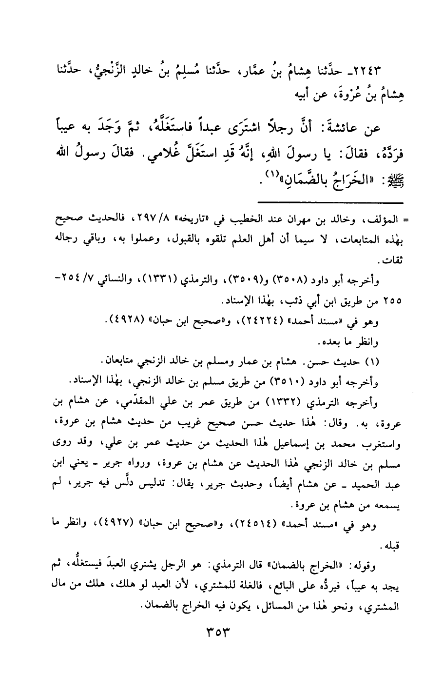2243- حَدَّثَنَا هِشَامُ بْنُ عَمَّارٍ ، حَدَّثَنَا مُسْلِمُ بْنُ خَالِدٍ الزَّنْجِيُّ ، حَدَّثَنَا هِشَامُ بْنُ عُرْوَةَ ، عَنْ أَبِيهِ ، عَنْ عَائِشَةَ ، أَنَّ رَجُلاً اشْتَرَى عَبْدًا فَاسْتَغَلَّهُ ، ثُمَّ وَجَدَ بِهِ عَيْبًا ، فَرَدَّهُ ، فَقَالَ : يَا رَسُولَ اللهِ ، إِنَّهُ قَدِ اسْتَغَلَّ غُلاَمِي ، فَقَالَ رَسُولُ اللهِ صَلَّى الله عَليْهِ وسَلَّمَ : الْخَرَاجُ بِالضَّمَانِ.